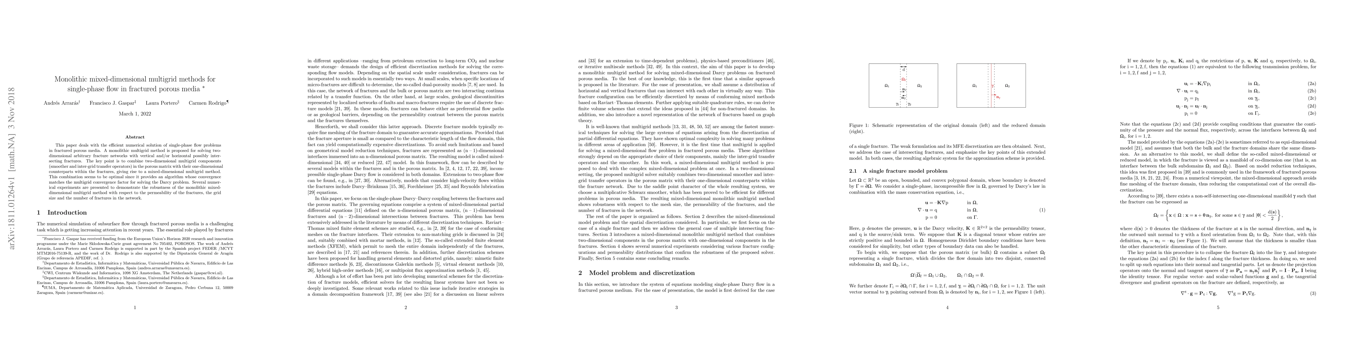This paper deals with the efficient numerical solution of single-phase flow problems in fractured porous media. A monolithic multigrid method is proposed for solving two-dimensional arbitrary fracture networks with vertical and/or horizontal possibly intersecting fractures. The key point is to combine two-dimensional multigrid components (smoother and inter-grid transfer operators) in the porous matrix with their one-dimensional counterparts within the fractures, giving rise to a mixed-dimensional multigrid method. This combination seems to be optimal since it provides an algorithm whose convergence matches the multigrid convergence factor for solving the Darcy problem. Several numerical experiments are presented to demonstrate the robustness of the monolithic mixed-dimensional multigrid method with respect to the permeability of the fractures, the grid size and the number of fractures in the network.