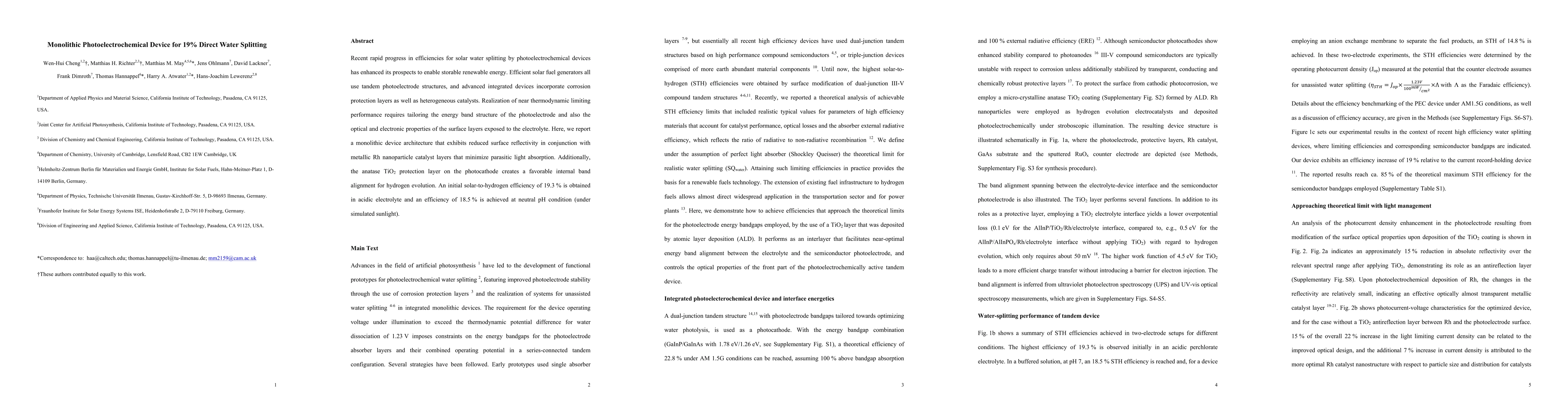 This paper reports a monolithic photoelectrochemical device achieving a high solar-to-hydrogen efficiency of 19.3% in acidic conditions and 18.5% at neutral pH, utilizing tailored energy band structures and metallic Rh catalysts to minimize light absorption and enhance hydrogen evolution.