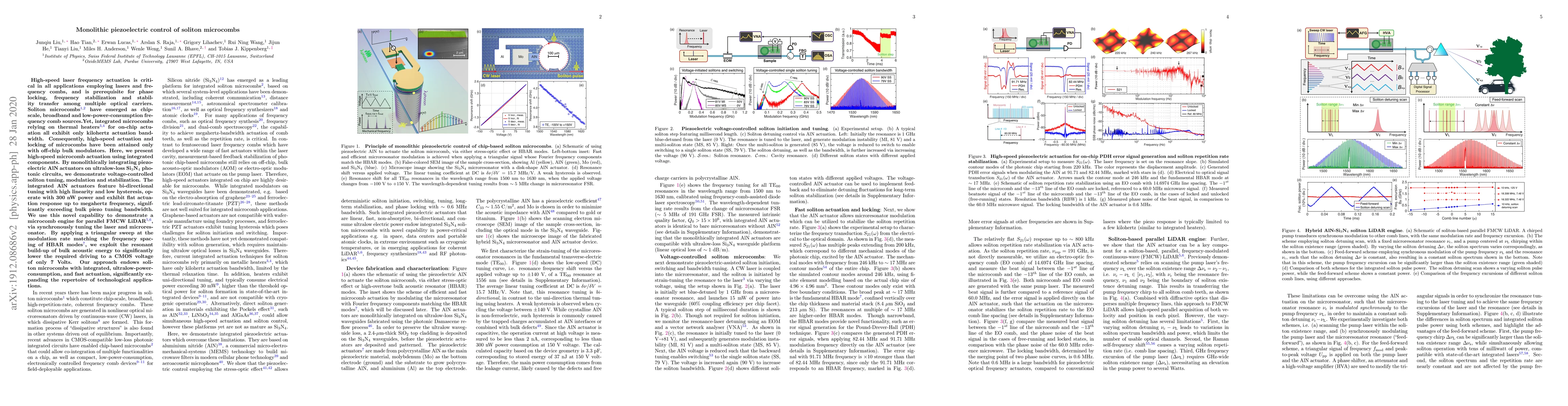 This research demonstrates high-speed, monolithic piezoelectric actuation of soliton microcombs using integrated AlN actuators on Si3N4 circuits, enabling low-power, wide-bandwidth control and stabilization for applications like parallel FMCW LiDAR. The approach provides an ultralow-power solution with significant improvements over traditional thermal actuation methods.