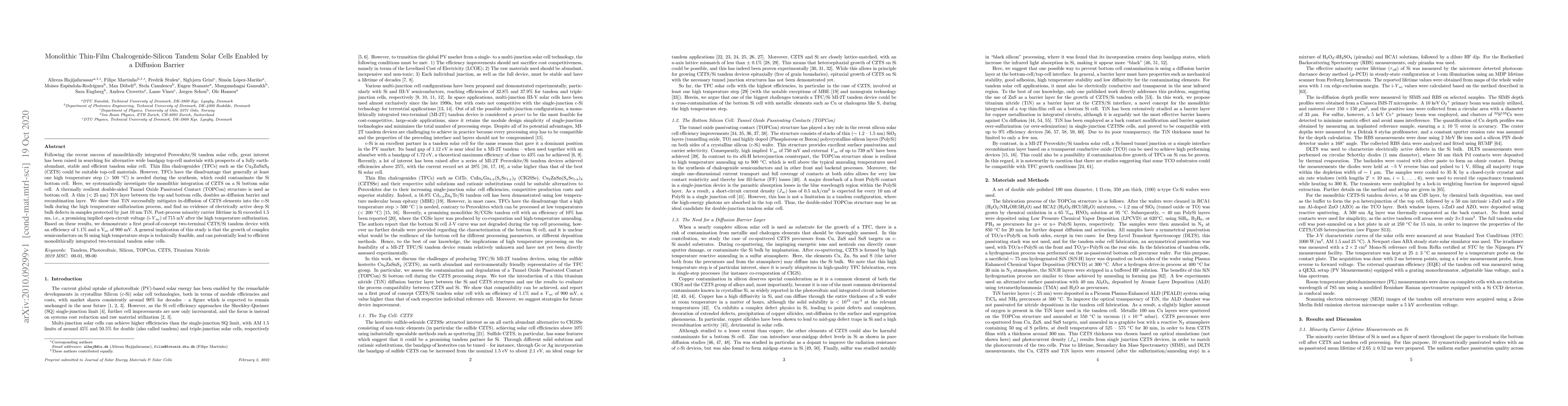 This paper investigates the integration of Cu2ZnSnS4 (CZTS) thin-film chalcogenide as a top cell in a monolithic CZTS/Si tandem solar cell, using a thin TiN layer as a diffusion barrier to prevent contamination during high-temperature synthesis. The study demonstrates a proof-of-concept tandem device with 1.1% efficiency and a promising open-circuit voltage of 900 mV.