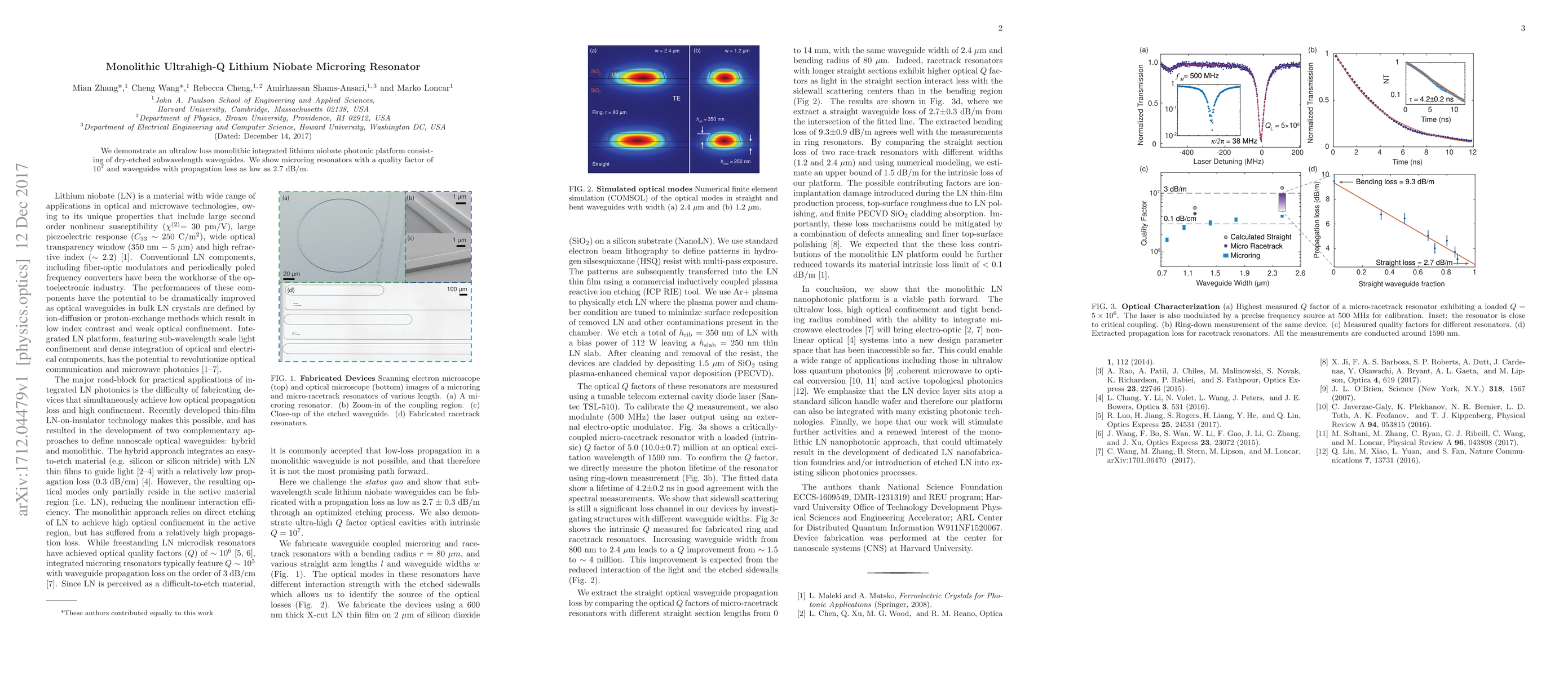 Summary: This research presents a monolithic lithium niobate photonic platform featuring ultrahigh-Q microring resonators with a quality factor of 10^7 and exceptionally low waveguide propagation loss of 2.7 dB/m, achieved through dry-etching techniques.