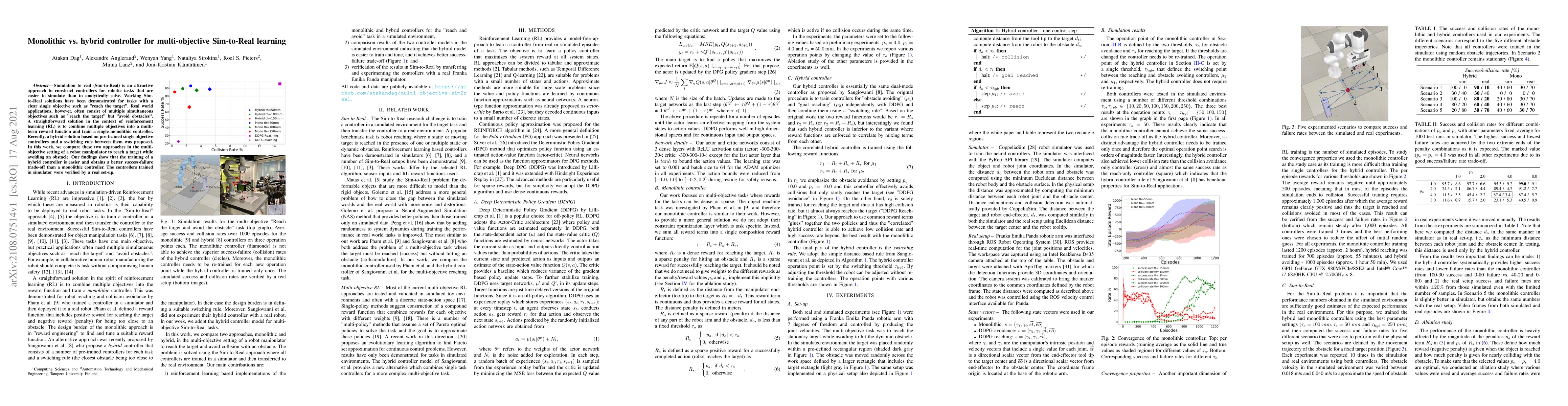 Researchers compared two approaches to training robotic controllers for multi-objective tasks: monolithic and hybrid methods. They found that the hybrid approach is easier to train and achieves a better success-failure trade-off.