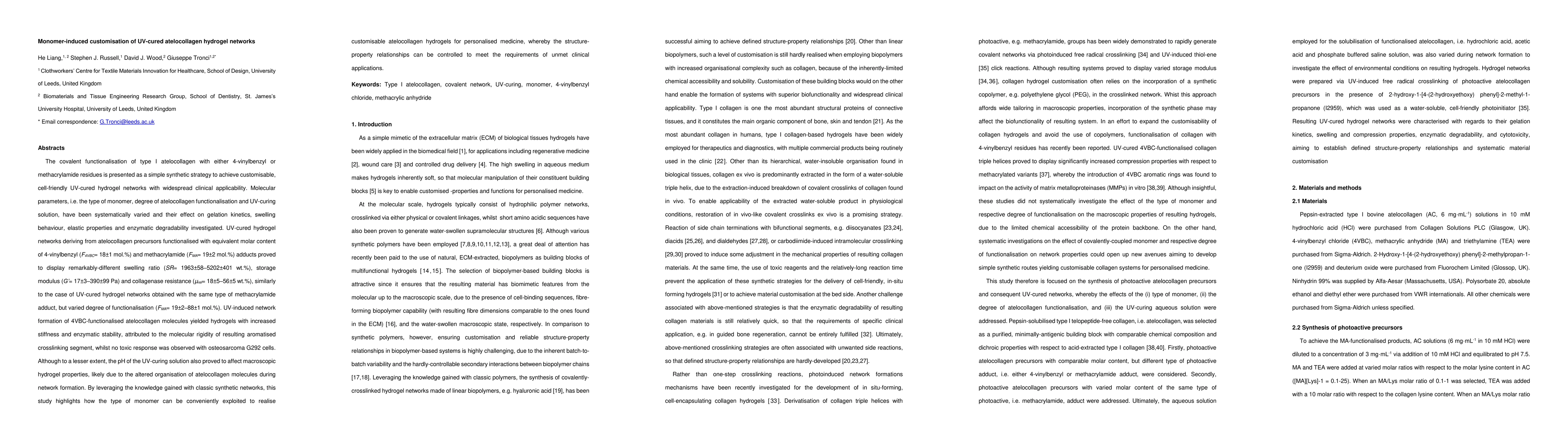 Researchers developed customizable UV-cured hydrogels from atelocollagen using different monomers, which affected swelling ratio, stiffness, and enzymatic stability, offering potential for clinical applications.