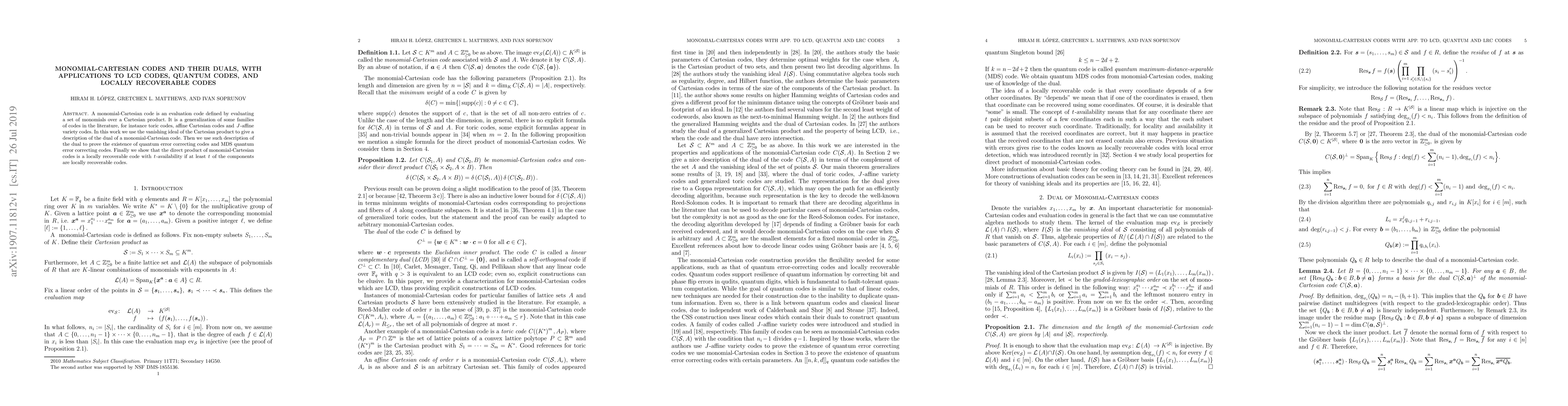 This paper explores monomial-Cartesian codes, which generalize toric and affine Cartesian codes, and provides a method to describe their duals using the vanishing ideal. It demonstrates applications in constructing quantum error-correcting codes and locally recoverable codes with specified availability.