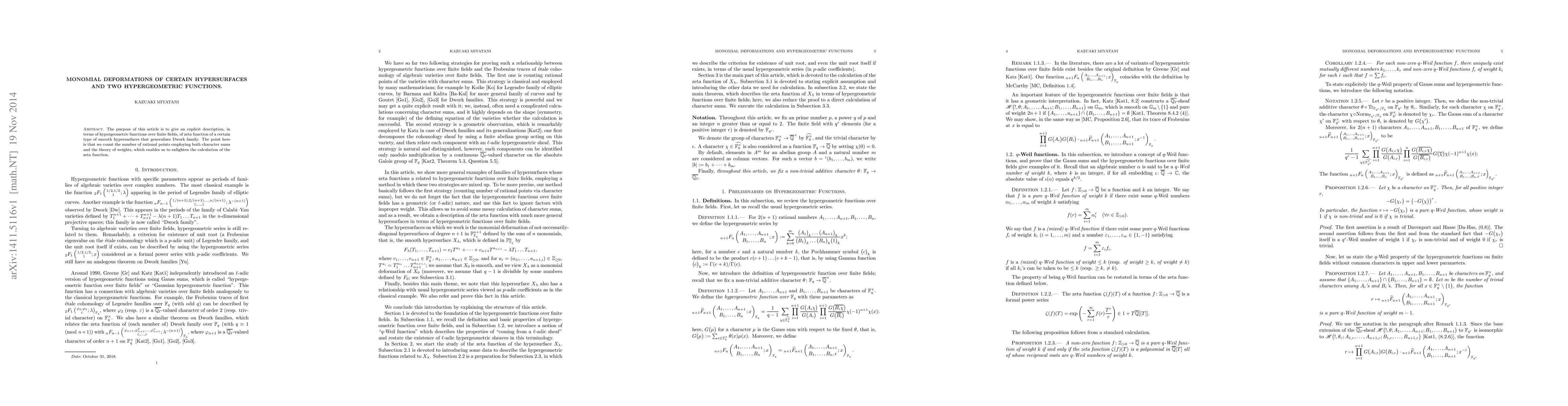 The purpose of this article is to give an explicit description, in terms of hypergeometric functions over finite fields, of zeta function of a certain type of smooth hypersurfaces that generalizes Dwork family. The point here is that we count the number of rational points employing both character sums and the theory of weights, which enables us to enlighten the calculation of the zeta function.