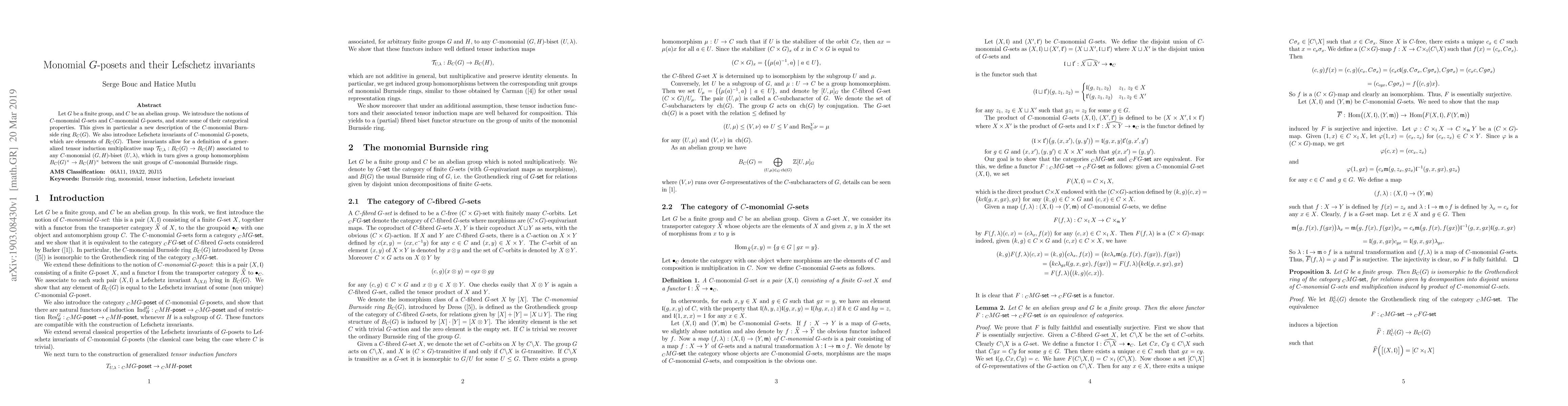 Let $G$ be a finite group, and $C$ be an abelian group. We introduce the notions of $C$-monomial $G$-sets and $C$-monomial $G$-posets, and state some of their categorical properties. This gives in particular a new description of the $C$-monomial Burnside ring $B_C(G)$. We also introduce Lefschetz invariants of $C$-monomial $G$-posets, which are elements of $B_C(G)$. These invariants allow for a definition of a generalized tensor induction multiplicative map $\mathcal{T}_{U,\lambda}: B_C(G)\to B_C(H)$ associated to any $C$-monomial $(G,H)$-biset $(U,\lambda)$, which in turn gives a group homomorphism $B_C(G)^\times\to B_C(H)^\times$ between the unit groups of $C$-monomial Burnside rings.