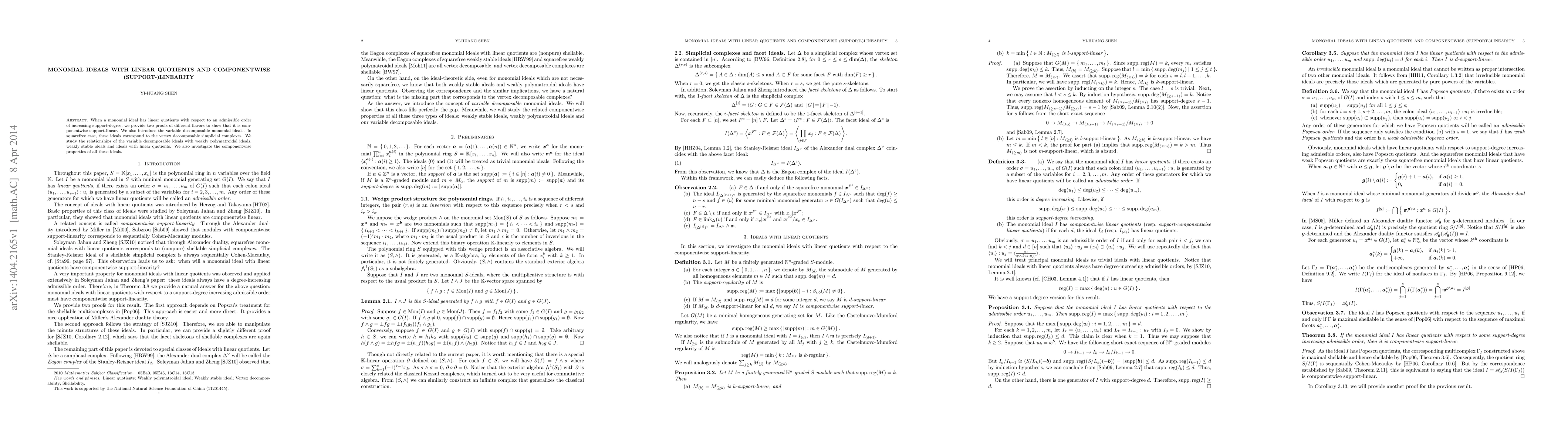 This paper explores monomial ideals with linear quotients, proving they are componentwise support-linear through two distinct proofs. It introduces variable decomposable monomial ideals, relating them to vertex decomposable simplicial complexes in the squarefree case, and investigates their connections to weakly polymatroidal, weakly stable, and linearly quotient ideals.