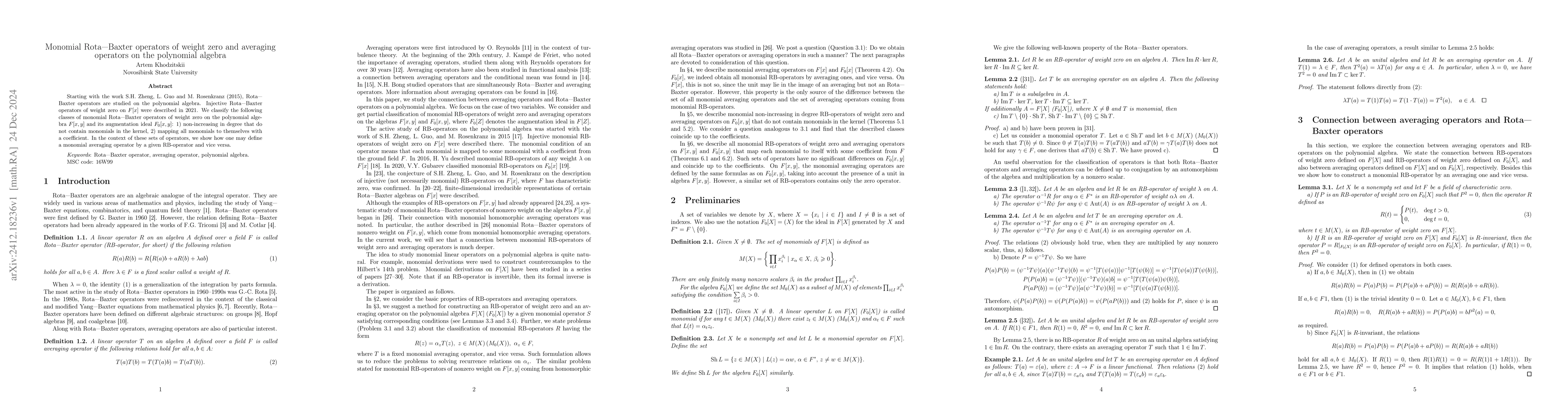 Starting with the work S.H. Zheng, L. Guo and M. Rosenkranz (2015), Rota-Baxter operators are studied on the polynomial algebra. Injective Rota-Baxter operators of weight zero on $F[x]$ were described in 2021. We classify the following classes of monomial Rota-Baxter operators of weight zero on the polynomial algebra $F[x,y]$ and its augmentation ideal $F_0[x,y]$: 1) non-increasing in degree that do not contain monomials in the kernel, 2) mapping all monomials to themselves with a coefficient. In the context of these sets of operators, we show how one may define a monomial averaging operator by a given RB-operator and vice versa.