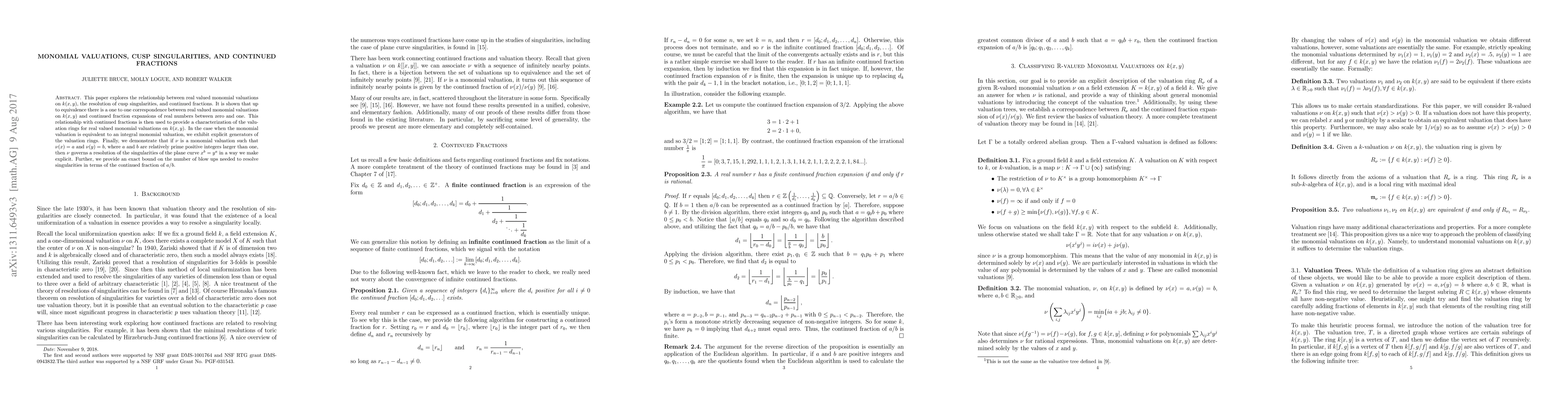 This paper explores the relationship between real valued monomial valuations on $k(x,y)$, the resolution of cusp singularities, and continued fractions. It is shown that up to equivalence there is a one to one correspondence between real valued monomial valuations on $k(x,y)$ and continued fraction expansions of real numbers between zero and one. This relationship with continued fractions is then used to provide a characterization of the valuation rings for real valued monomial valuations on $k(x,y)$. In the case when the monomial valuation is equivalent to an integral monomial valuation, we exhibit explicit generators of the valuation rings. Finally, we demonstrate that if $\nu$ is a monomial valuation such that $\nu(x)=a$ and $\nu(y)=b$, where $a$ and $b$ are relatively prime positive integers larger than one, then $\nu$ governs a resolution of the singularities of the plane curve $x^{b}=y^{a}$ in a way we make explicit. Further, we provide an exact bound on the number of blow ups needed to resolve singularities in terms of the continued fraction of $a/b$