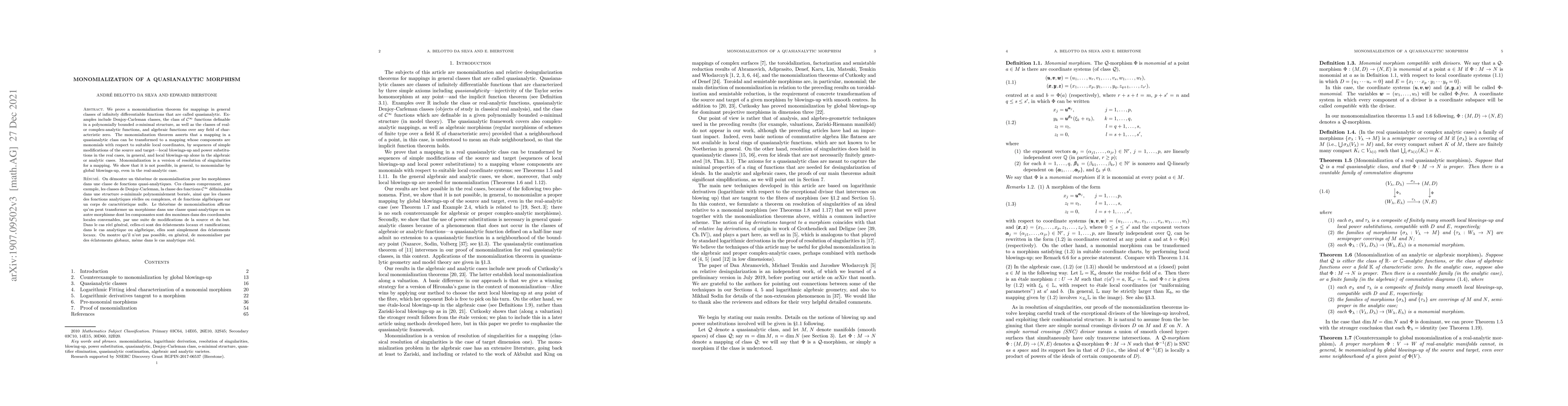 We prove a monomialization theorem for mappings in general classes of infinitely differentiable functions that are called quasianalytic. Examples include Denjoy-Carleman classes, the class of $\cC^\infty$ functions definable in a polynomially bounded $o$-minimal structure, as well as the classes of real- or complex analytic functions, and algebraic functions over any field of characteristic zero. The monomialization theorem asserts that a mapping in a quasianalytic class can be transformed to a mapping whose components are monomials with respect to suitable local coordinates, by sequences of simple modifications of the source and target -- local blowings-up and power substitutions in the real cases, in general, and local blowings-up alone in the algebraic or analytic cases. Monomialization is a version of resolution of singularities for a mapping. We show that it is not possible, in general, to monomialize by global blowings-up, even in the real-analytic case.