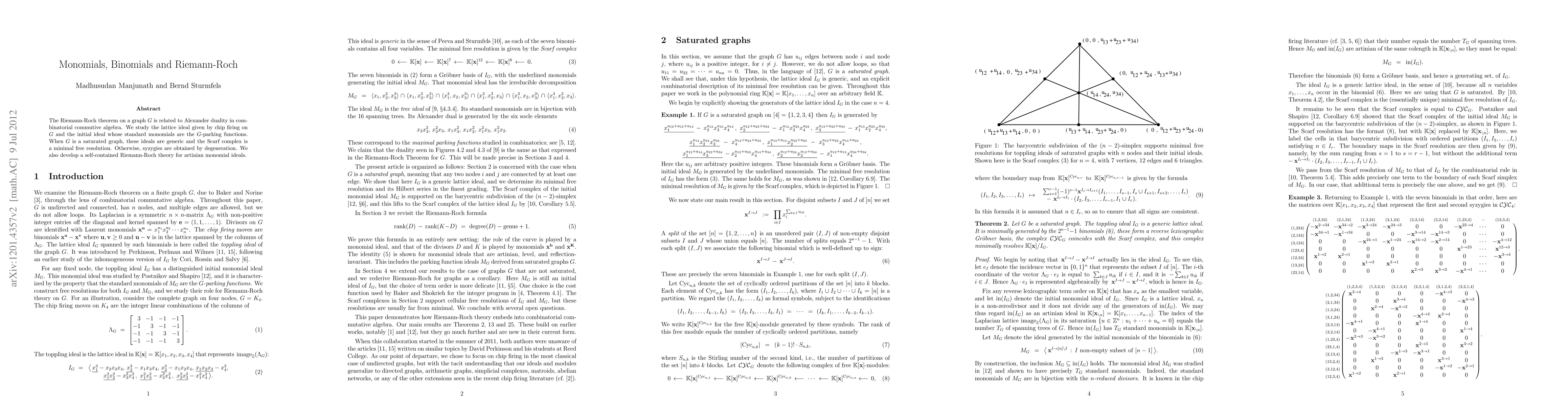The paper explores the connection between the Riemann-Roch theorem on graphs and Alexander duality, focusing on lattice ideals from chip firing and initial ideals of G-parking functions. It presents a minimal free resolution for saturated graphs and develops a Riemann-Roch theory for artinian monomial ideals.