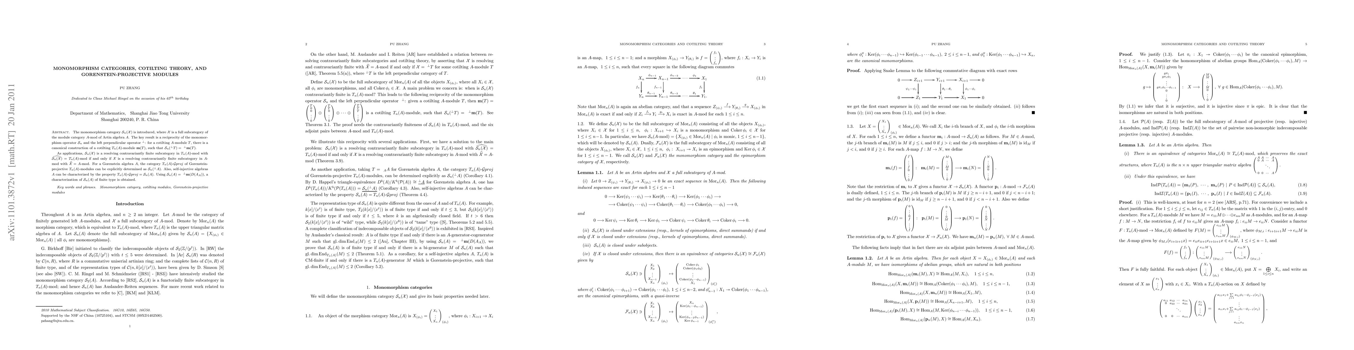 The monomorphism category $\mathcal S_n(\mathcal X)$ is introduced, where $\mathcal X$ is a full subcategory of the module category $A$-mod of Artin algebra $A$. The key result is a reciprocity of the monomorphism operator $\mathcal S_n$ and the left perpendicular operator $^\perp$: for a cotilting $A$-module $T$, there is a canonical construction of a cotilting $T_n(A)$-module ${\rm \bf m}(T)$, such that $\mathcal S_n(^\perp T) = \ ^\perp {\rm \bf m}(T)$. As applications, $\mathcal S_n(\mathcal X)$ is a resolving contravariantly finite subcategory in $T_n(A)$-mod with $\hat{\mathcal S_n(\mathcal X)} = T_n(A)$-mod if and only if $\mathcal X$ is a resolving contravariantly finite subcategory in $A$-mod with $\hat{\mathcal X} = A$-mod. For a Gorenstein algebra $A$, the category $T_n(A)\mbox{-}\mathcal Gproj$ of Gorenstein-projective $T_n(A)$-modules can be explicitly determined as $\mathcal S_n(^\perp A)$. Also, self-injective algebras $A$ can be characterized by the property $T_n(A)\mbox{-}\mathcal Gproj = \mathcal S_n(A)$. Using $\mathcal S_n(A)= \ ^\perp {\rm \bf m}(D(A_A))$, a characterization of $\mathcal S_n(A)$ of finite type is obtained.