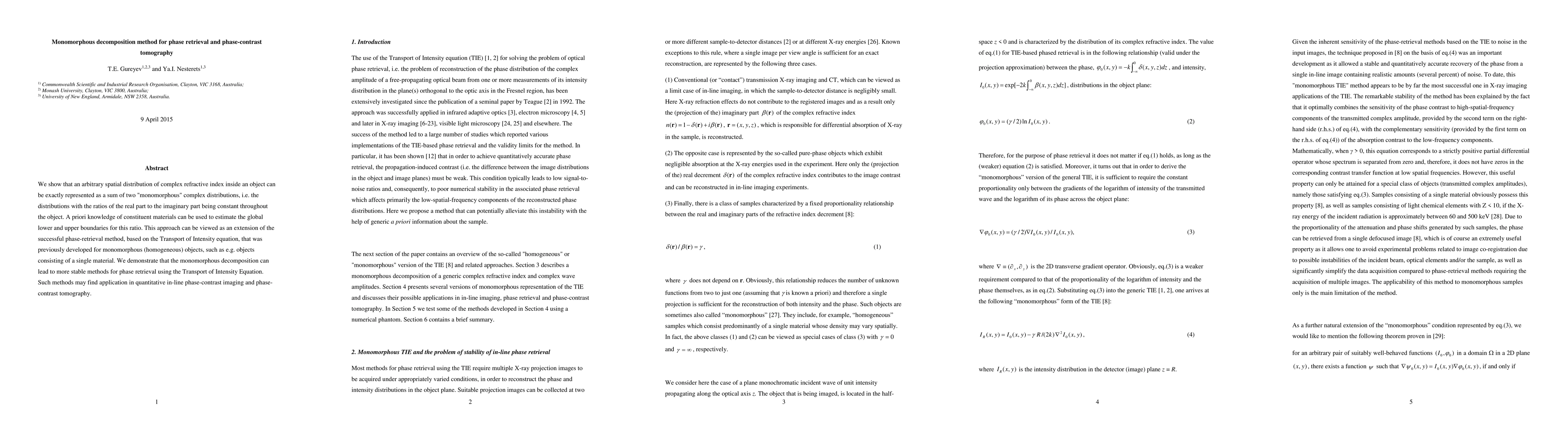 We show that an arbitrary spatial distribution of complex refractive index inside an object can be exactly represented as a sum of two "monomorphous" complex distributions, i.e. the distributions with the ratios of the real part to the imaginary part being constant throughout the object. A priori knowledge of constituent materials can be used to estimate the global lower and upper boundaries for this ratio. This approach can be viewed as an extension of the successful phase-retrieval method, based on the Transport of Intensity equation, that was previously developed for monomorphous (homogeneous) objects, such as e.g. objects consisting of a single material. We demonstrate that the monomorphous decomposition can lead to more stable methods for phase retrieval using the Transport of Intensity Equation. Such methods may find application in quantitative in-line phase-contrast imaging and phase-contrast tomography.