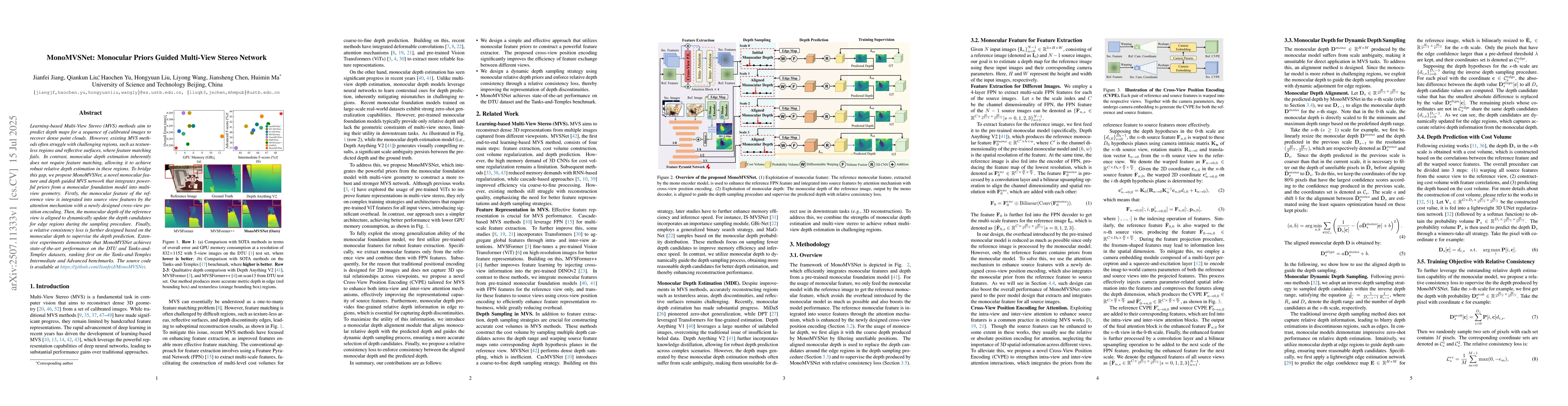 Learning-based Multi-View Stereo (MVS) methods aim to predict depth maps for a sequence of calibrated images to recover dense point clouds. However, existing MVS methods often struggle with challenging regions, such as textureless regions and reflective surfaces, where feature matching fails. In contrast, monocular depth estimation inherently does not require feature matching, allowing it to achieve robust relative depth estimation in these regions. To bridge this gap, we propose MonoMVSNet, a novel monocular feature and depth guided MVS network that integrates powerful priors from a monocular foundation model into multi-view geometry. Firstly, the monocular feature of the reference view is integrated into source view features by the attention mechanism with a newly designed cross-view position encoding. Then, the monocular depth of the reference view is aligned to dynamically update the depth candidates for edge regions during the sampling procedure. Finally, a relative consistency loss is further designed based on the monocular depth to supervise the depth prediction. Extensive experiments demonstrate that MonoMVSNet achieves state-of-the-art performance on the DTU and Tanks-and-Temples datasets, ranking first on the Tanks-and-Temples Intermediate and Advanced benchmarks. The source code is available at https://github.com/JianfeiJ/MonoMVSNet.