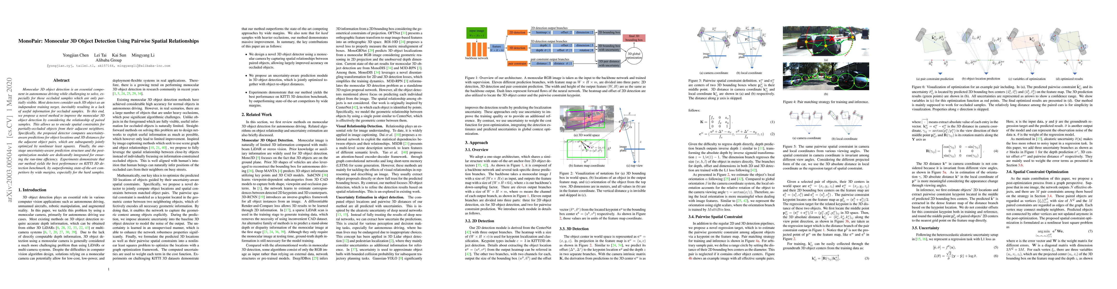 The paper proposes MonoPair, a novel method for monocular 3D object detection that leverages pairwise spatial relationships between objects to enhance detection of partially occluded samples. The method jointly optimizes uncertainty-aware predictions for object pairs, achieving superior performance on the KITTI benchmark, especially for challenging cases.