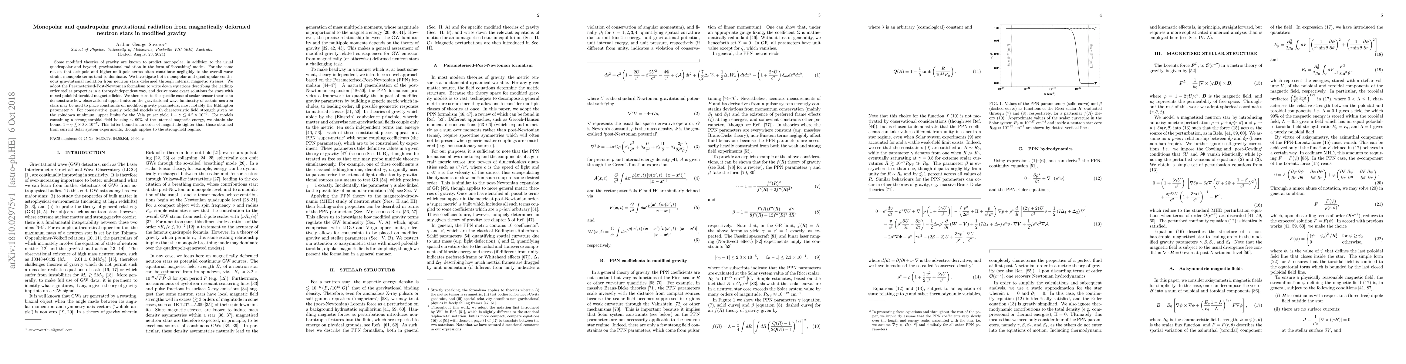 Some modified theories of gravity are known to predict monopolar, in addition to the usual quadrupolar and beyond, gravitational radiation in the form of `breathing' modes. For the same reason that octupole and higher-multipole terms often contribute negligibly to the overall wave strain, monopole terms tend to dominate. We investigate both monopolar and quadrupolar continuous gravitational radiation from neutron stars deformed through internal magnetic stresses. We adopt the Parameterised-Post-Newtonian formalism to write down equations describing the leading-order stellar properties in a theory-independent way, and derive some exact solutions for stars with mixed poloidal-toroidal magnetic fields. We then turn to the specific case of scalar-tensor theories to demonstrate how observational upper limits on the gravitational-wave luminosity of certain neutron stars may be used to place constraints on modified gravity parameters, most notably the Eddington parameter $\gamma$. For conservative, purely poloidal models with characteristic field strength given by the spindown minimum, upper limits for the Vela pulsar yield $1-\gamma \lesssim 4.2 \times 10^{-3}$. For models containing a strong toroidal field housing $\sim 99\%$ of the internal magnetic energy, we obtain the bound $1- \gamma \lesssim 8.0 \times 10^{-7}$. This latter bound is an order of magnitude tighter than those obtained from current Solar system experiments, though applies to the strong-field regime.