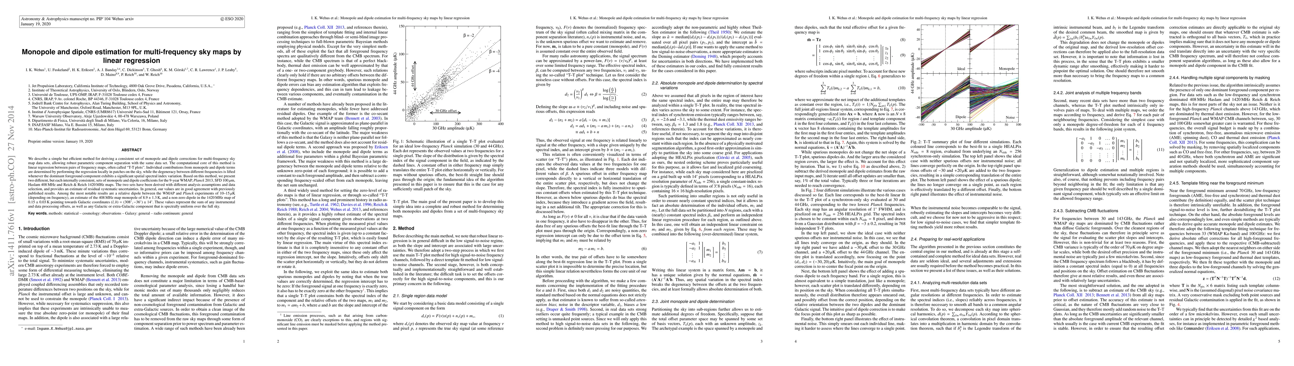 This research introduces a linear regression method for estimating monopole and dipole corrections in multi-frequency sky map datasets, enabling robust component separation. The method, applied to WMAP, Planck, SFD 100um, Haslam 408MHz, and Reich & Reich 1420MHz maps, yields consistent monopole and dipole coefficient sets. Key findings include a WMAP-Planck relative dipole of 10-15 uK, a 408MHz map monopole of 8.9 +- 1.3 K, and a non-zero dipole in the 1420MHz map, representing systematic offsets and uniform sky components.