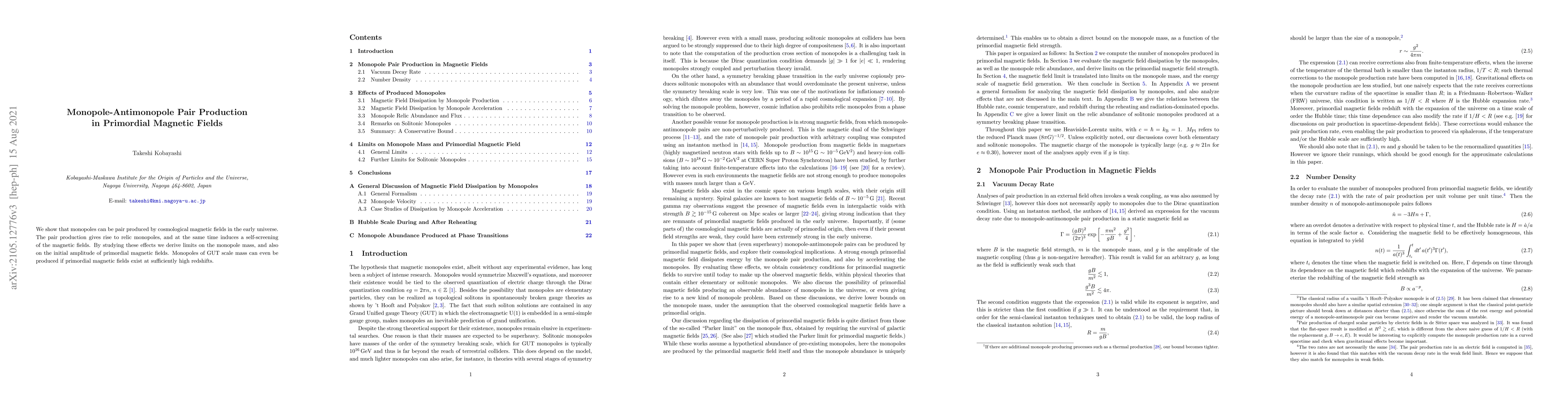 This paper demonstrates that cosmological magnetic fields in the early universe can produce monopole-antimonopole pairs, leading to relic monopoles and self-screening of magnetic fields. The study provides constraints on monopole mass and the initial amplitude of primordial magnetic fields, suggesting that GUT scale monopoles could form under certain conditions.