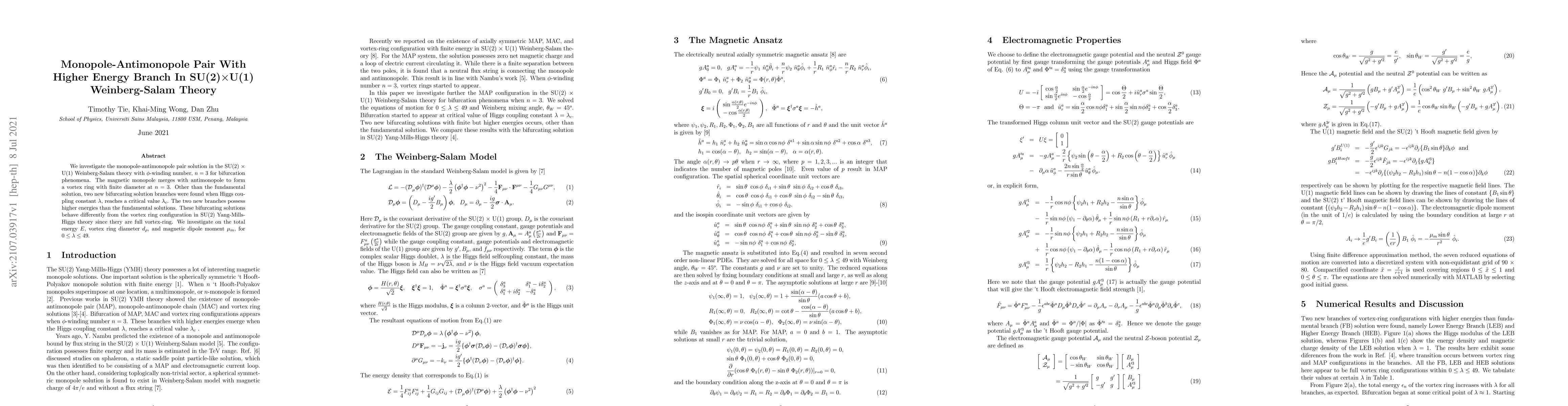 This paper studies monopole-antimonopole pair solutions in the Weinberg-Salam theory, finding bifurcation phenomena at $\phi$-winding number $n=3$. Two new higher-energy solution branches emerge when the Higgs coupling constant $\lambda$ reaches a critical value, differing from fundamental solutions due to their full vortex-ring configuration.