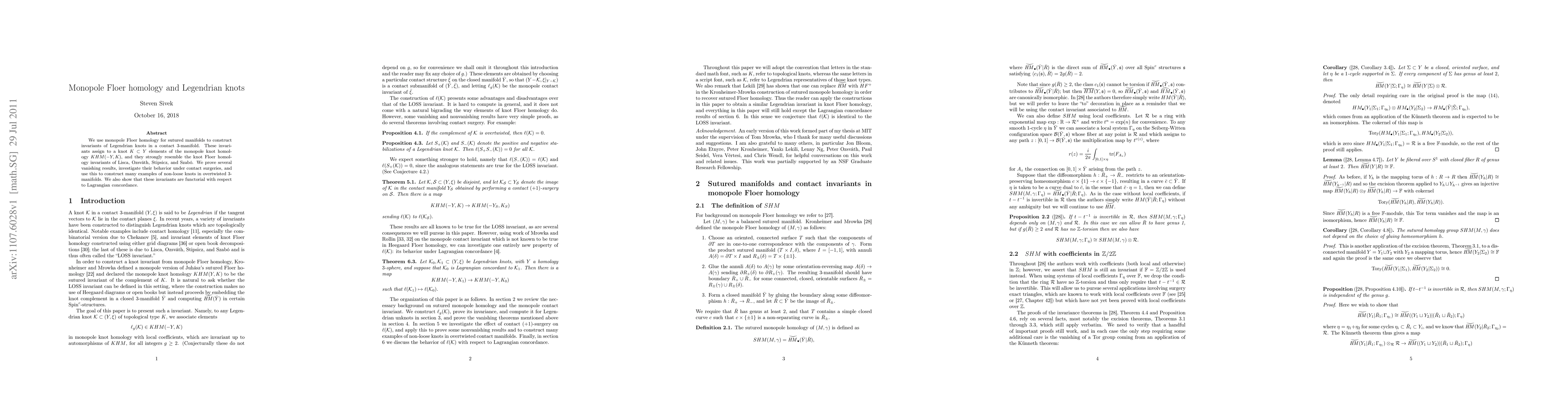 This paper constructs invariants of Legendrian knots using monopole Floer homology for sutured manifolds, resembling knot Floer homology. The invariants are functorial under Lagrangian concordance and help identify non-loose knots in overtwisted 3-manifolds, while also proving various vanishing results and analyzing their behavior under contact surgeries.