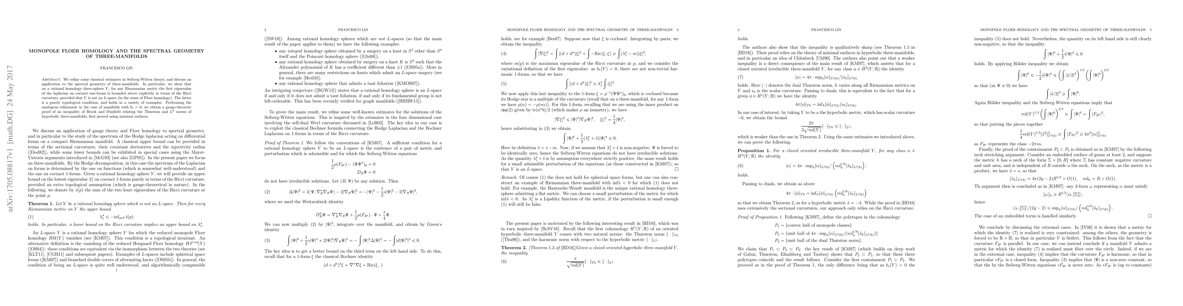 We refine some classical estimates in Seiberg-Witten theory, and discuss an application to the spectral geometry of three-manifolds. In particular, we show that on a rational homology three-sphere $Y$, for any Riemannian metric the first eigenvalue of the laplacian on coexact one-forms is bounded above explicitly in terms of the Ricci curvature, provided that $Y$ is not an $L$-space (in the sense of Floer homology). The latter is a purely topological condition, and holds in a variety of examples. Performing the analogous refinement in the case of manifolds with $b_1>0$, we obtain a gauge-theoretic proof of an inequality of Brock and Dunfield relating the Thurston and $L^2$ norms of hyperbolic three-manifolds, first proved using minimal surfaces.