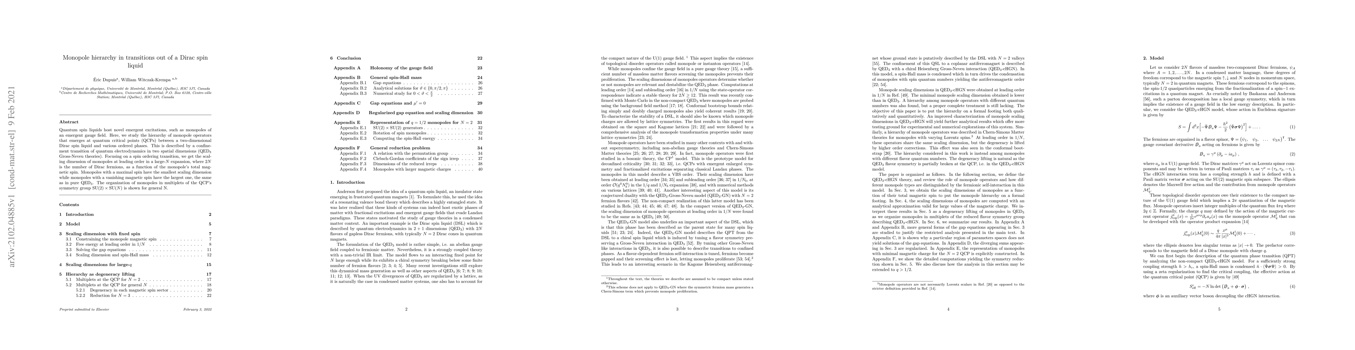 Quantum spin liquids host novel emergent excitations, such as monopoles of an emergent gauge field. Here, we study the hierarchy of monopole operators that emerges at quantum critical points (QCPs) between a two-dimensional Dirac spin liquid and various ordered phases. This is described by a confinement transition of quantum electrodynamics in two spatial dimensions (QED3 Gross-Neveu theories). Focusing on a spin ordering transition, we get the scaling dimension of monopoles at leading order in a large-N expansion, where 2N is the number of Dirac fermions, as a function of the monopole's total magnetic spin. Monopoles with a maximal spin have the smallest scaling dimension while monopoles with a vanishing magnetic spin have the largest one, the same as in pure QED3. The organization of monopoles in multiplets of the QCP's symmetry group SU(2) x SU(N) is shown for general N.