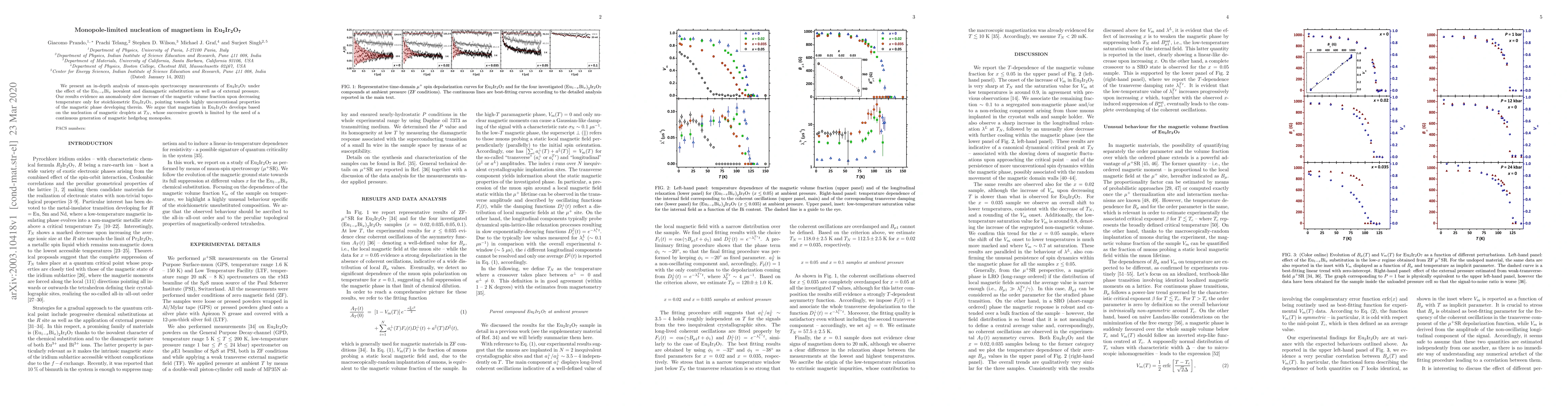 We present an in-depth analysis of muon-spin spectroscopy measurements of Eu$_{2}$Ir$_{2}$O$_{7}$ under the effect of the Eu$_{1-x}$Bi$_{x}$ isovalent and diamagnetic substitution as well as of external pressure. Our results evidence an anomalously slow increase of the magnetic volume fraction upon decreasing temperature only for stoichiometric Eu$_{2}$Ir$_{2}$O$_{7}$, pointing towards highly unconventional properties of the magnetic phase developing therein. We argue that magnetism in Eu$_{2}$Ir$_{2}$O$_{7}$ develops based on the nucleation of magnetic droplets at $T_{N}$, whose successive growth is limited by the need of a continuous generation of magnetic hedgehog monopoles.