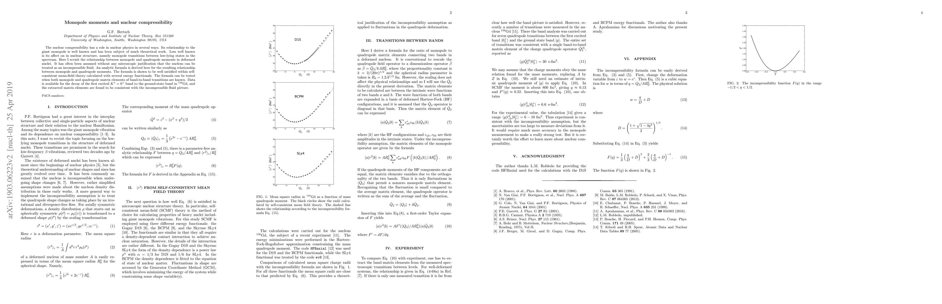 This paper explores the relationship between nuclear compressibility and monopole moments, deriving an analytic formula for the connection between monopole and quadrupole moments in deformed nuclei. The derived formula aligns well with self-consistent mean-field theory calculations and is tested with data from the decay of $^{156}$Gd, supporting the incompressible fluid model.