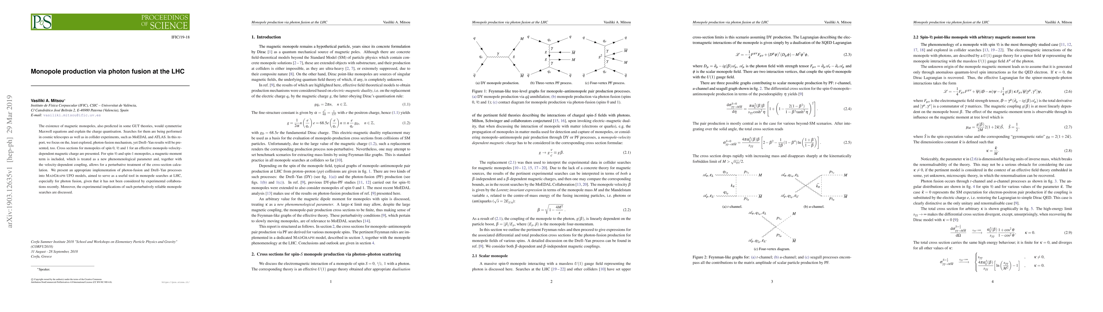 The existence of magnetic monopoles, also predicted in some GUT theories, would symmetrise Maxwell equations and explain the charge quantisation. Searches for them are being performed in cosmic telescopes as well as in collider experiments, such as MoEDAL and ATLAS. In this report, we focus on the, least explored, photon-fusion mechanism, yet Drell-Yan results are discussed, too. Cross sections for monopoles of spin 0, 1/2 and 1 for an effective monopole-velocity-dependent magnetic charge are presented. For spin-1/2 and spin-1 monopoles, a magnetic-moment term is included, which is treated as a new phenomenological parameter and, together with the velocity-dependent coupling, allows for a perturbative treatment of the cross-section calculation. We present an appropriate implementation of photon-fusion and Drell-Yan processes into MadGraph UFO models, aimed to serve as a useful tool in monopole searches at LHC, especially for photon fusion, given that it has not been considered by experimental collaborations recently. Moreover, the experimental implications of such perturbatively reliable monopole searches are discussed.