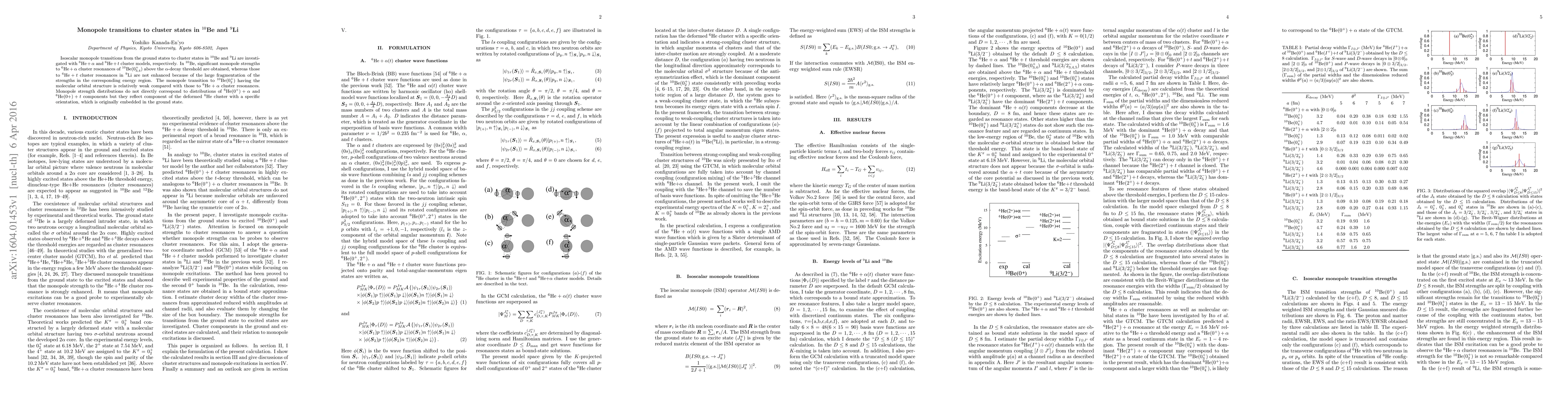 Isoscalar monopole transitions from the ground states to cluster states in $\Be$ and $\Li$ are investigated with $\He+\alpha$ and $\He+t$ cluster models, respectively. In $\Be$, significant monopole strengths to $\He+\alpha$ cluster resonances of $\Be(0^+_{3,4})$ above the $\alpha$-decay threshold are obtained, whereas those to $\He+t$ cluster resonances in $^9$Li are not enhanced because of the large fragmentation of the strengths in the corresponding energy region. The monopole transition to $\Be(0^+_2)$ having the molecular orbital structure is relatively weak compared with those to $\He+\alpha$ cluster resonances. Monopole strength distributions do not directly correspond to distributions of $\He(0^+)+\alpha$ and $\He(0+)+t$ components but they reflect component of the deformed $\He$ cluster with a specific orientation, which is originally embedded in the ground state.