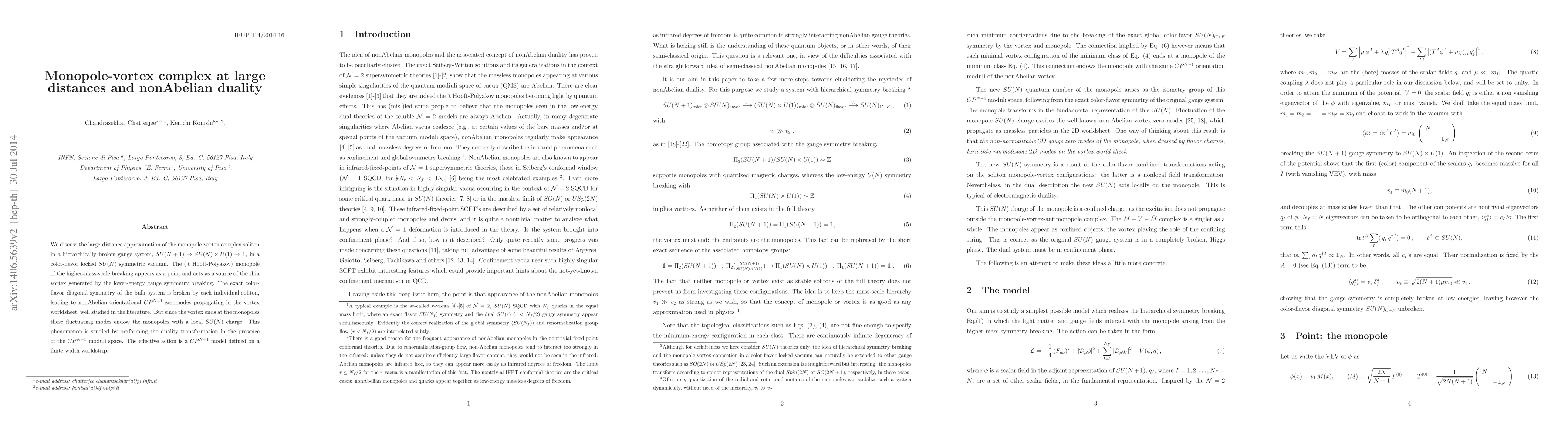 We discuss the large-distance approximation of the monopole-vortex complex soliton in a hierarchically broken gauge system, SU(N+1) - > SU(N) x U(1) - > 1, in a color-flavor locked SU(N) symmetric vacuum. The ('t Hooft-Polyakov) monopole of the higher-mass-scale breaking appears as a point and acts as a source of the thin vortex generated by the lower-energy gauge symmetry breaking. The exact color-flavor diagonal symmetry of the bulk system is broken by each individual soliton, leading to nonAbelian orientational CP^{N-1} zeromodes propagating in the vortex worldsheet, well studied in the literature. But since the vortex ends at the monopoles these fluctuating modes endow the monopoles with a local SU(N) charge. This phenomenon is studied by performing the duality transformation in the presence of the CP^{N-1} moduli space. The effective action is a CP^{N-1} model defined on a finite-width worldstrip.