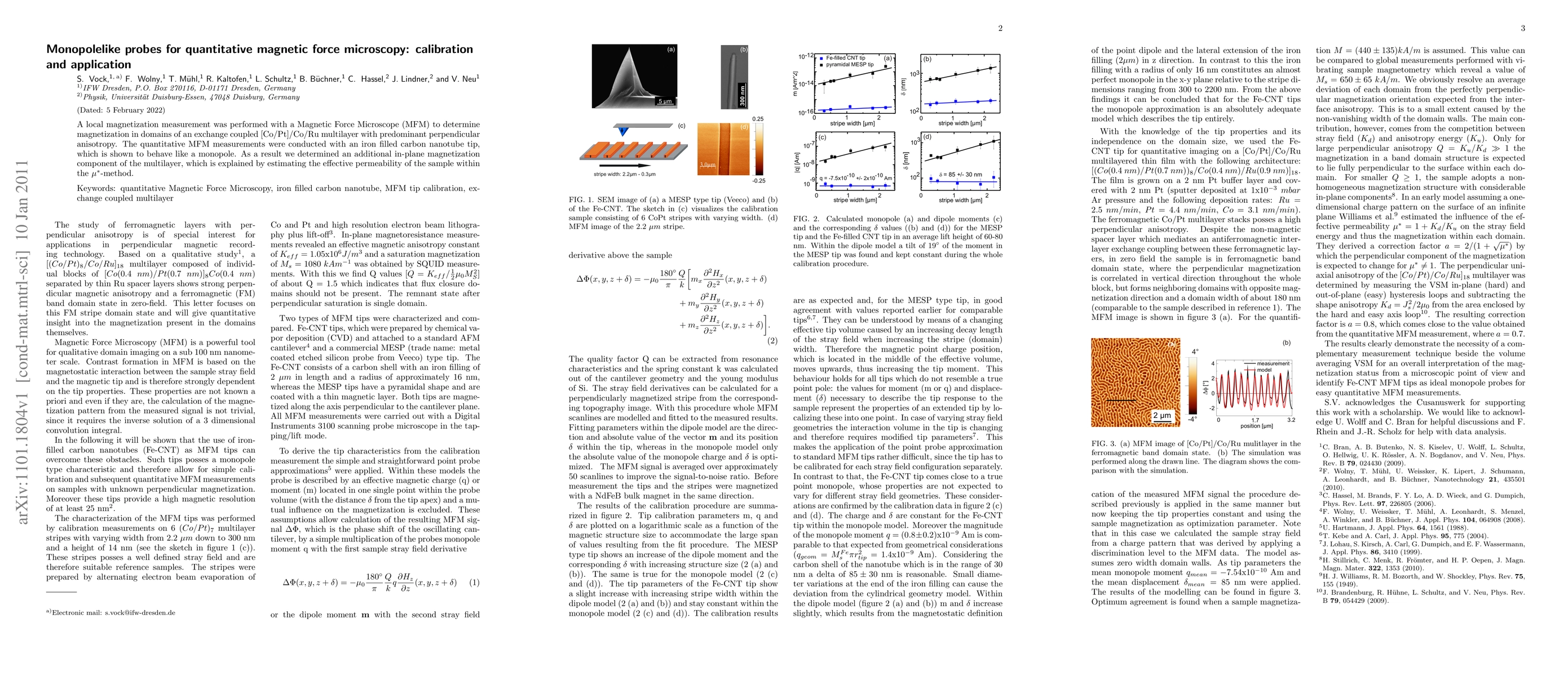 This paper presents quantitative magnetic force microscopy (MFM) using an iron-filled carbon nanotube tip behaving as a monopole to measure magnetization in domains of an exchange-coupled [Co/Pt]/Co/Ru multilayer. The study reveals an additional in-plane magnetization component, explained by estimating the effective permeability using the μ*-method.