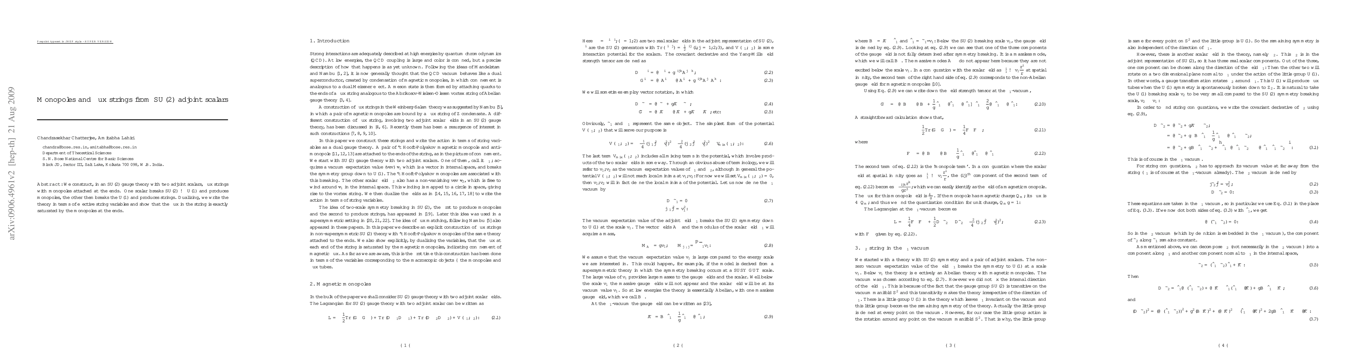 We construct, in an SU(2) gauge theory with two adjoint scalars, flux strings with monopoles attached at the ends. One scalar breaks SU(2) to U(1) and produces monopoles, the other then breaks the U(1) and produces strings. Dualizing, we write the theory in terms of effective string variables and show that the flux in the string is exactly saturated by the monopoles at the ends.