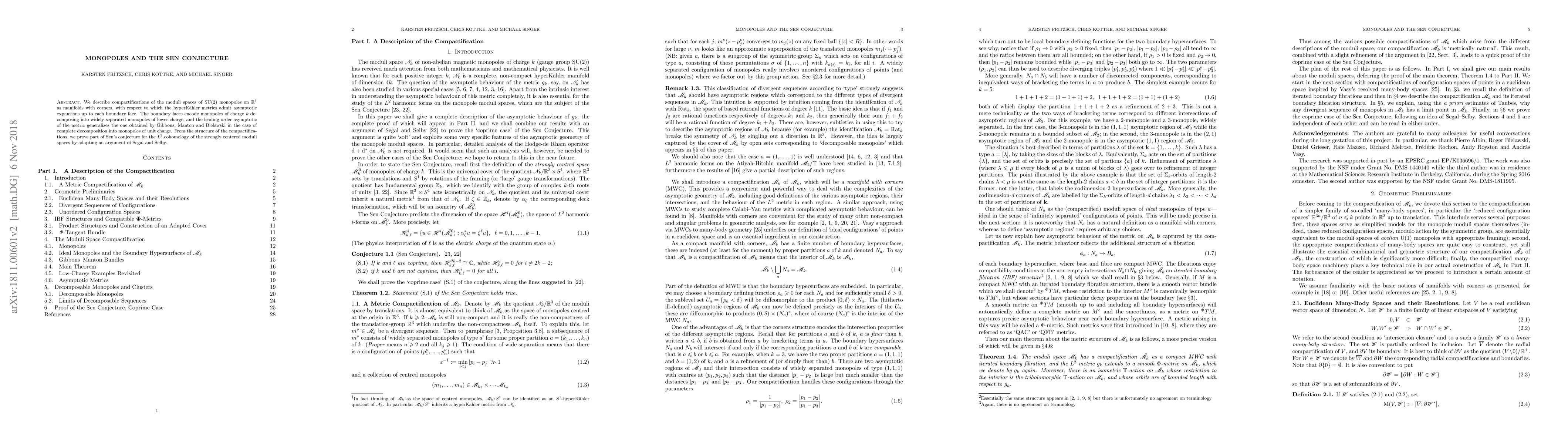 We describe compactifications of the moduli spaces of SU(2) monopoles on R3 as manifolds with corners, with respect to which the hyperKaehler metrics admit asymptotic expansions up to each boundary face. The boundary faces encode monopoles of charge k decomposing into widely separated monopoles of lower charge, and the leading order asymptotic of the metric generalizes the one obtained by Gibbons, Manton and Bielawski in the case of complete decomposition into monopoles of unit charge. From the structure of the compactifications, we prove part of Sen's conjecture for the L2 cohomology of the strongly centered moduli spaces by adapting an argument of Segal and Selby.