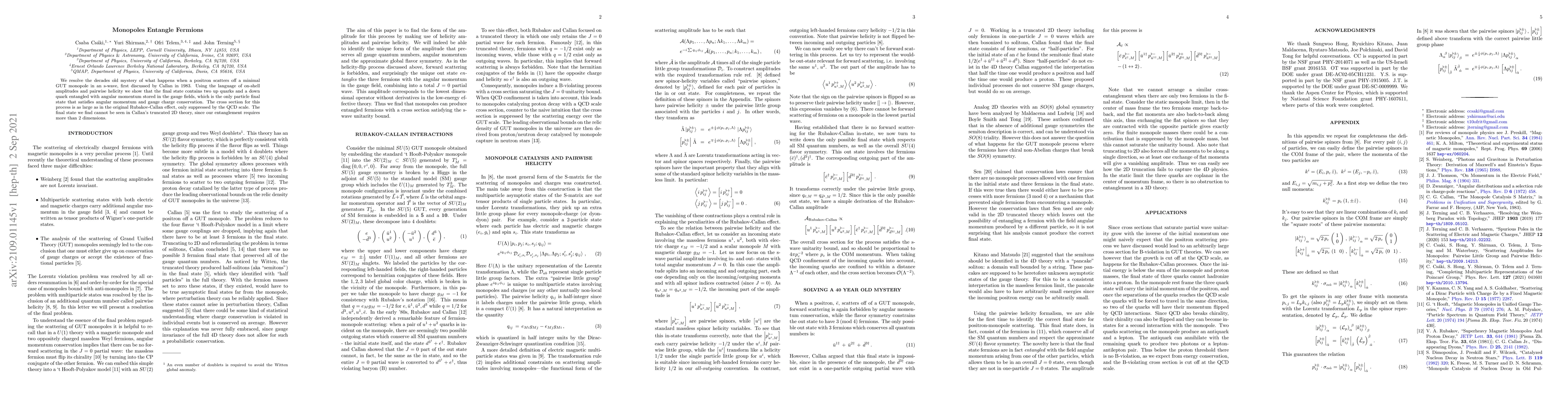 We resolve the decades old mystery of what happens when a positron scatters off a minimal GUT monopole in an s-wave, first discussed by Callan in 1983. Using the language of on-shell amplitudes and pairwise helicity we show that the final state contains two up quarks and a down quark entangled with angular momentum stored in the gauge fields, which is the only particle final state that satisfies angular momentum and gauge charge conservation. The cross section for this process is as large as in the original Rubakov-Callan effect, only suppressed by the QCD scale. The final state we find cannot be seen in Callan's truncated 2D theory, since our entanglement requires more than 2 dimensions.