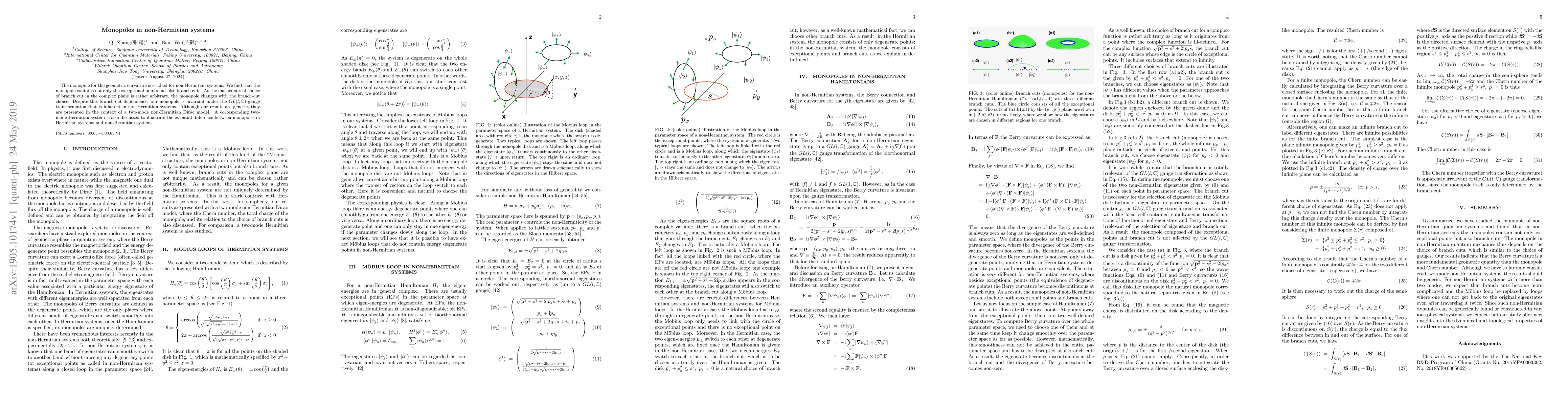 This paper explores monopoles in non-Hermitian systems, revealing that they encompass exceptional points and branch cuts, with the monopole's form varying with the choice of branch cut. Despite this variability, the monopole remains invariant under $GL(l,\mathbb{C})$ gauge transformations, distinguishing it from monopoles in Hermitian systems.