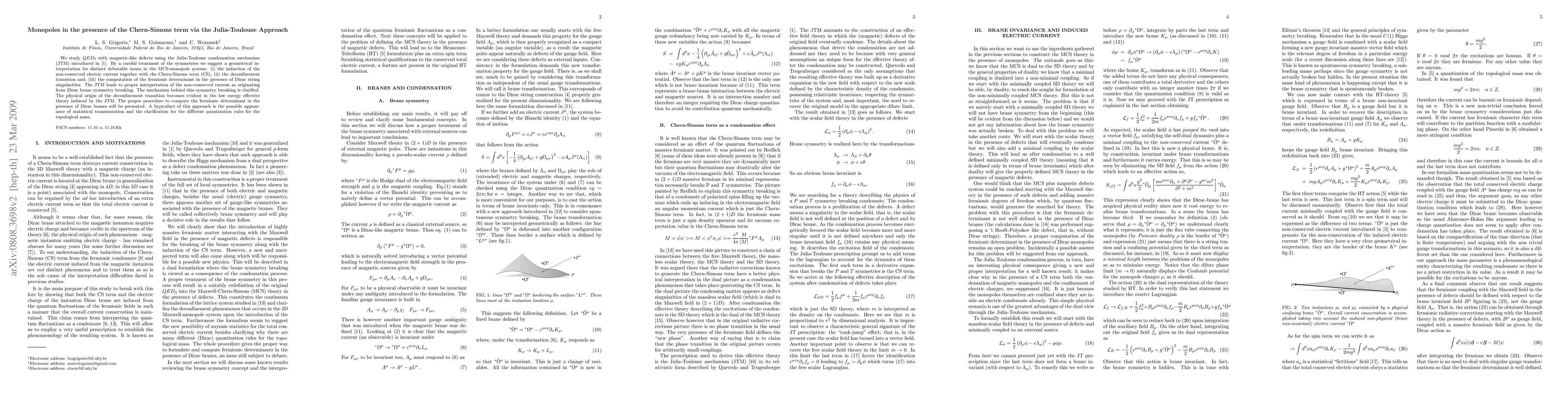 We study $QED_3$ with magnetic-like defects using the Julia-Toulouse condensation mechanism (JTM). By a careful treatment of the symmetries we suggest a geometrical interpretation for distinct debatable issues in the MCS-monopole system: (i) the induction of the non-conserved electric current together with the Chern-Simons term (CS), (ii) the deconfinement transition and, (iii) the computation of the fermionic determinant in the presence of Dirac string singularities. The JTM leads to proper interpretation of the non-conserved current as originating from Dirac brane symmetry breaking. The mechanism behind this symmetry breaking is clarified. The physical origin of the deconfinement transition becomes evident in the low energy effective theory induced by the JTM. The proper procedure to compute the fermionic determinant in the presence of Dirac branes will be presented. A byproduct of this approach is the possible appearance of statistical transmutation and the clarification for the different quantization rules for the topological mass.