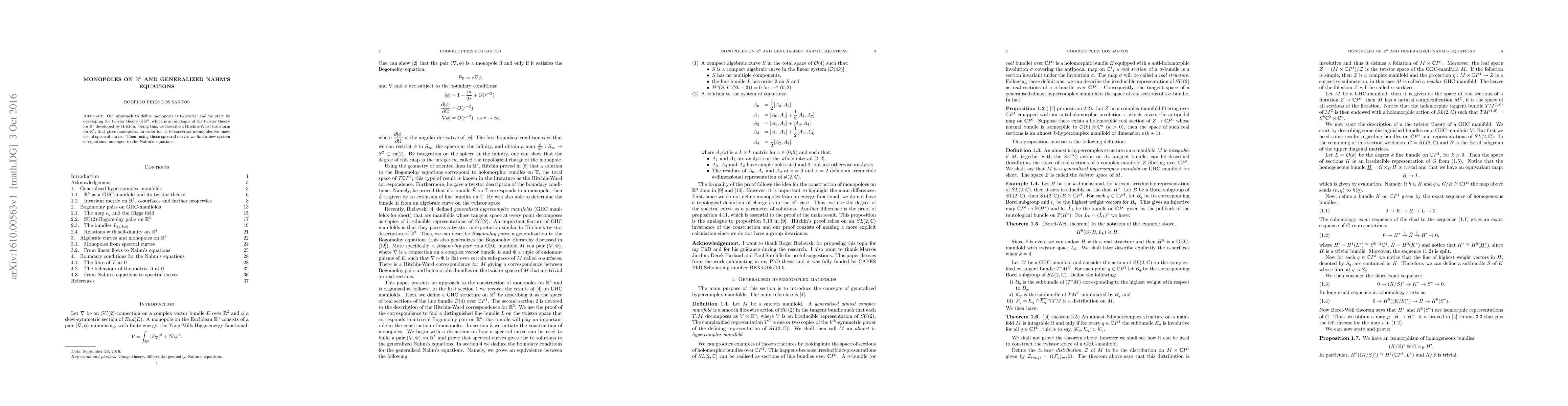 Our approach to define monopoles is twistorial and we start by developing the twistor theory of R^5, which is an analogue of the twistor theory for R^3 developed by Hitchin. Using this, we describe a Hitchin-Ward transform for R^5, that gives monopoles. In order for us to construct monopoles we make use of spectral curves. Then, using those spectral curves we find a new system of equations, analogue to the Nahm's equations.