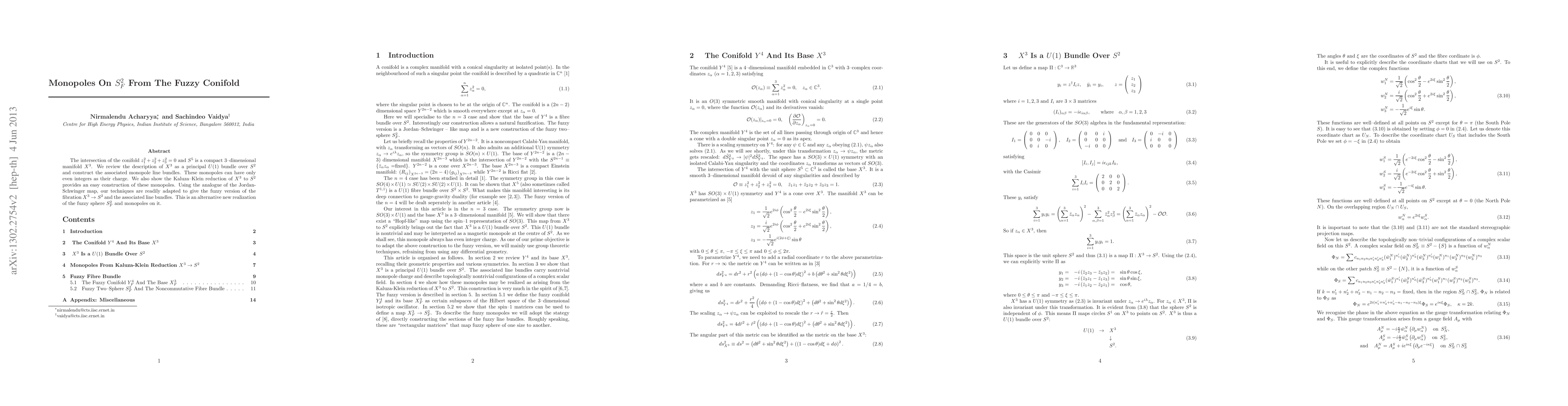 The intersection of the conifold $z_1^2+z_2^2+z_3^2 =0$ and $S^5$ is a compact 3--dimensional manifold $X^3$. We review the description of $X^3$ as a principal U(1) bundle over $S^2$ and construct the associated monopole line bundles. These monopoles can have only even integers as their charge. We also show the Kaluza--Klein reduction of $X^3$ to $S^2$ provides an easy construction of these monopoles. Using the analogue of the Jordon-Schwinger map, our techniques are readily adapted to give the fuzzy version of the fibration $X^3 \rightarrow S^2$ and the associated line bundles. This is an alternative new realization of the fuzzy sphere $S^2_F$ and monopoles on it.