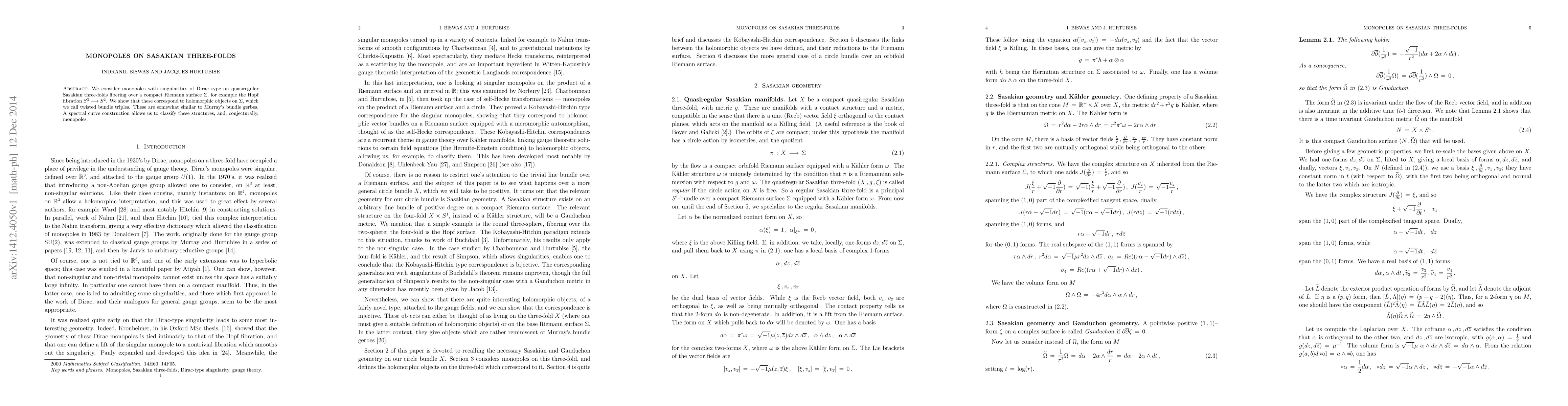 We consider monopoles with singularities of Dirac type on quasiregular Sasakian three-folds fibering over a compact Riemann surface $\Sigma$, for example the Hopf fibration $S^3\longrightarrow S^2$. We show that these correspond to holomorphic objects on $\Sigma$, which we call twisted bundle triples. These are somewhat similar to Murray's bundle gerbes. A spectral curve construction allows us to classify these structures, and, conjecturally, monopoles.