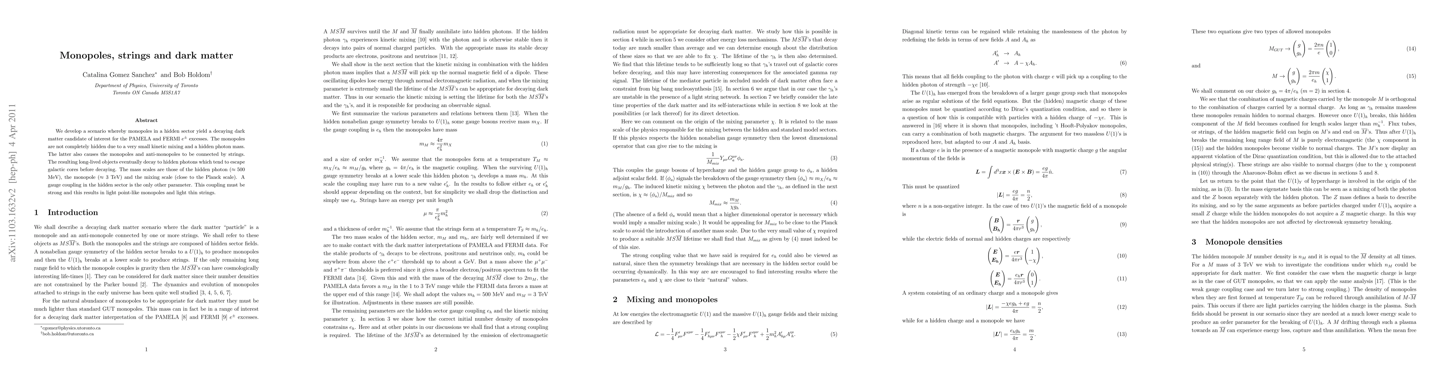 We develop a scenario whereby monopoles in a hidden sector yield a decaying dark matter candidate of interest for the PAMELA and FERMI $e^\pm$ excesses. The monopoles are not completely hidden due to a very small kinetic mixing and a hidden photon mass. The latter also causes the monopoles and anti-monopoles to be connected by strings. The resulting long-lived objects eventually decay to hidden photons which tend to escape galactic cores before decaying. The mass scales are those of the hidden photon ($\approx 500$ MeV), the monopole ($\approx 3$ TeV) and the mixing scale (close to the Planck scale). A gauge coupling in the hidden sector is the only other parameter. This coupling must be strong and this results in light point-like monopoles and light thin strings.