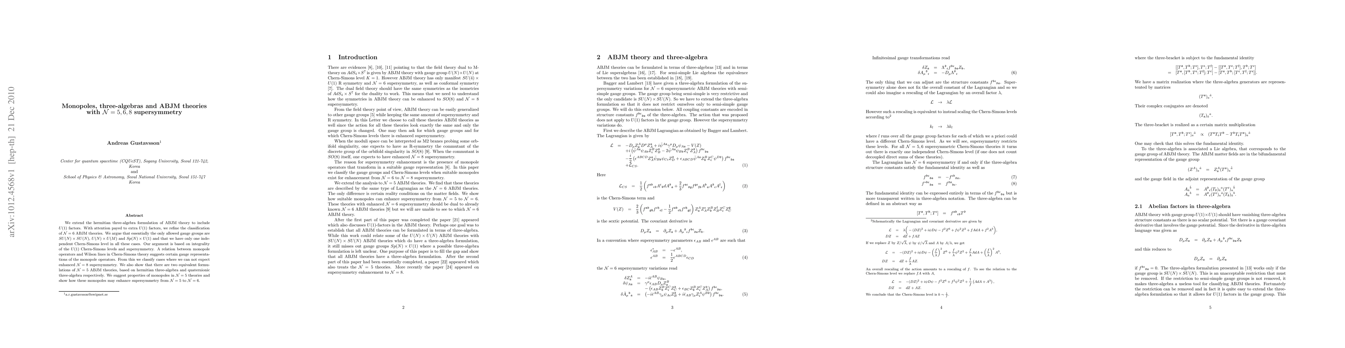 We extend the hermitian three-algebra formulation of ABJM theory to include $U(1)$ factors. With attention payed to extra $U(1)$ factors, we refine the classification of $\N=6$ ABJM theories. We argue that essentially the only allowed gauge groups are $SU(N)\times SU(N)$, $U(N)\times U(M)$ and $Sp(N)\times U(1)$ and that we have only one independent Chern-Simons level in all these cases. Our argument is based on integrality of the $U(1)$ Chern-Simons levels and supersymmetry. A relation between monopole operators and Wilson lines in Chern-Simons theory suggests certain gauge representations of the monopole operators. From this we classify cases where we can not expect enhanced $\N=8$ supersymmetry. We also show that there are two equivalent formulations of $\N=5$ ABJM theories, based on hermitian three-algebra and quaternionic three-algebra respectively. We suggest properties of monopoles in $\N=5$ theories and show how these monopoles may enhance supersymmetry from $\N=5$ to $\N=6$.