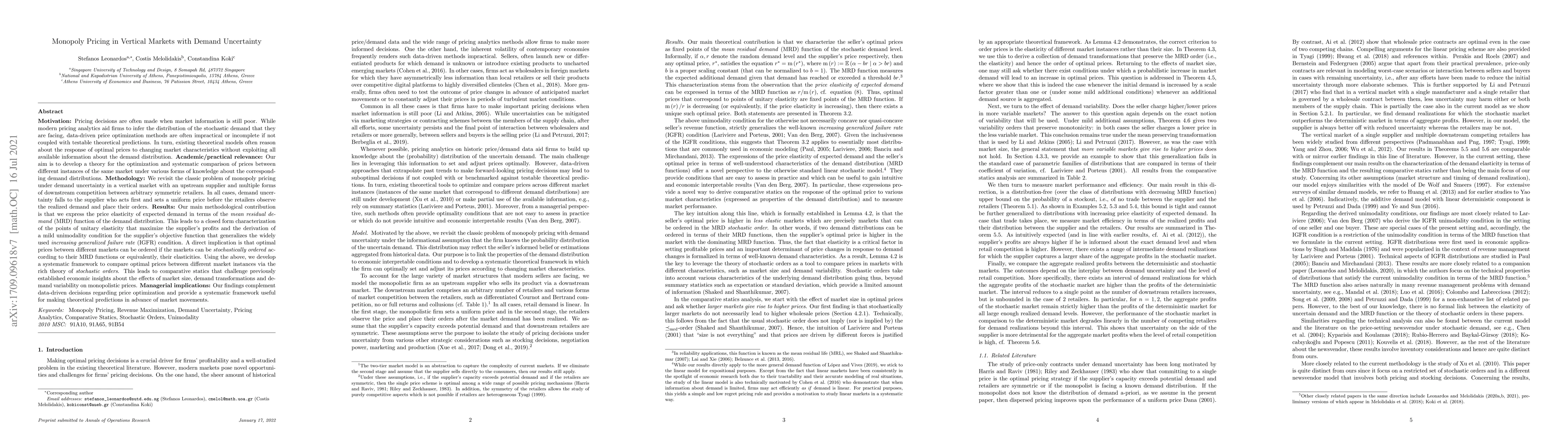 This paper develops a theory for optimizing monopoly pricing under demand uncertainty in vertical markets, introducing a novel approach to express price elasticity in terms of the mean residual demand function. It provides a comparative framework to analyze optimal prices across different market instances, challenging existing economic insights on the impact of market size and demand variability.