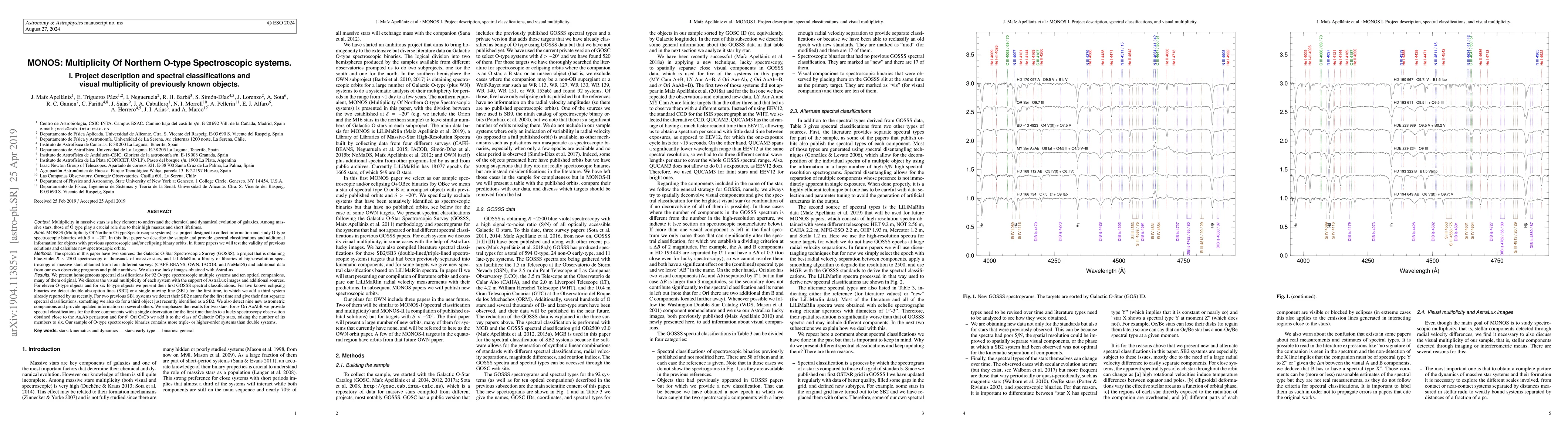 [ABRIDGED] AIMS. MONOS is collecting information and studying O-type spectroscopic binaries with delta > -20 deg. In this 1st paper we describe the sample and provide spectral classifications and additional information for objects with previous SB or EB orbits. In the future we will test the validity of previous solutions and calculate new SB orbits. METHODS.The spectra in this paper have 2 sources: GOSSS, which is obtaining blue-violet R~2500 spectroscopy of thousands of massive stars, and LiLiMaRlin, a library of libraries of high-resolution spectroscopy of massive stars obtained from 4 different surveys and additional data from our own observing programs and public archives. We also use lucky images from AstraLux. RESULTS. We present homogeneous spectral classifications for 92 O-type spectroscopic multiple systems and 10 optical companions. We discuss the visual multiplicity of each system with the support of AstraLux images and additional sources. For 11 O-type objects and for 6 B-type objects we present their first GOSSS spectral classifications. For 2 known EBs we detect SB2/SB1 lines for the first time, to which we add a third system already reported by us recently. For 2 previous SB1 systems we detect their SB2 nature for the first time and give their first separate spectral classifications, something we also do for a 3rd object just recently identified as a SB2. We also detect 9 new astrometric companions and provide updated information on several others. For sigma Ori AaAbB we provide spectral classifications for the 3 components with a single observation for the first time thanks to a lucky spectroscopy observation obtained close to the Aa,Ab periastron and for theta^1 Ori CaCb we add it to the class of Galactic Of?p stars, raising the number of its members to 6. Our sample of O-type spectroscopic binaries contains more triple/higher-order systems than double systems.