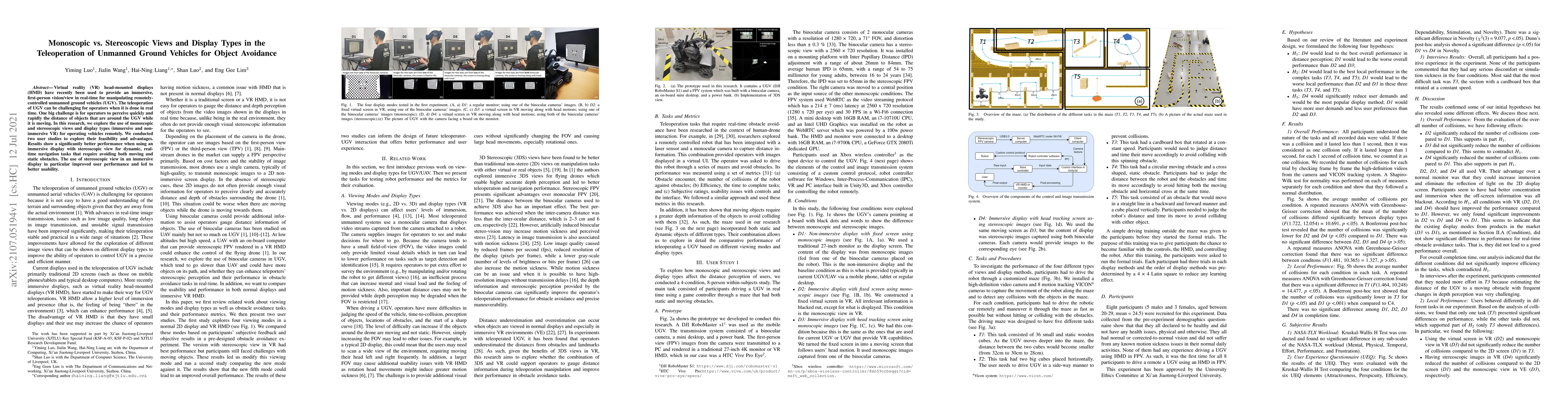 This research investigates the effectiveness of monoscopic vs. stereoscopic views in immersive and non-immersive VR for teleoperating unmanned ground vehicles (UGV) to avoid obstacles. Results from user studies indicate significantly better performance with immersive VR and stereoscopic views, especially for real-time navigation tasks.