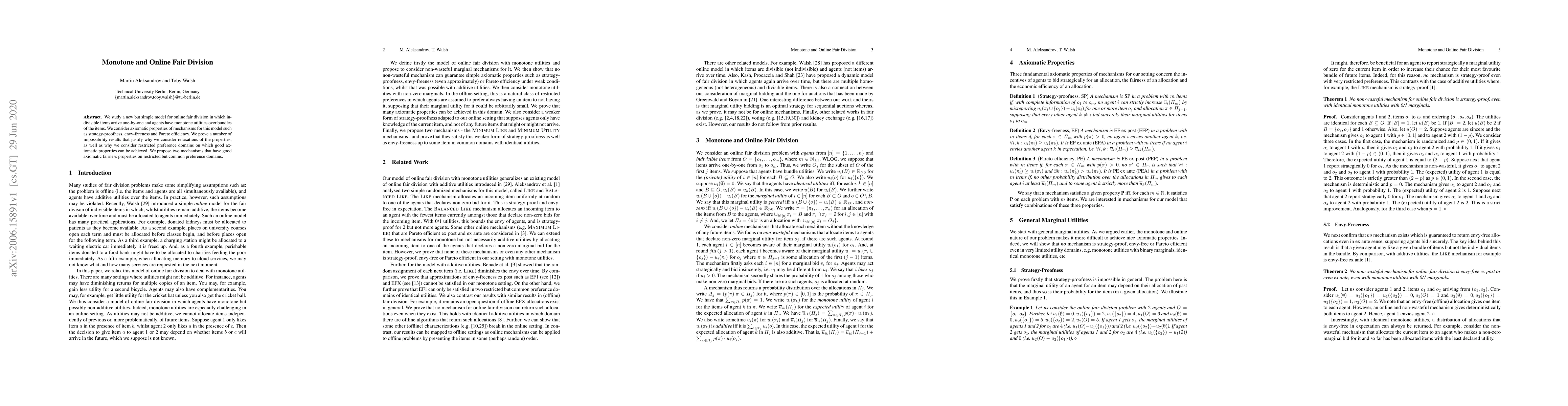This paper explores an online fair division model where items arrive sequentially and agents have monotone utility functions. It investigates axiomatic properties like strategy-proofness, envy-freeness, and Pareto efficiency, proving impossibility results that necessitate mechanism relaxations and preference domain restrictions. The authors propose two mechanisms that achieve good fairness properties under these constraints.