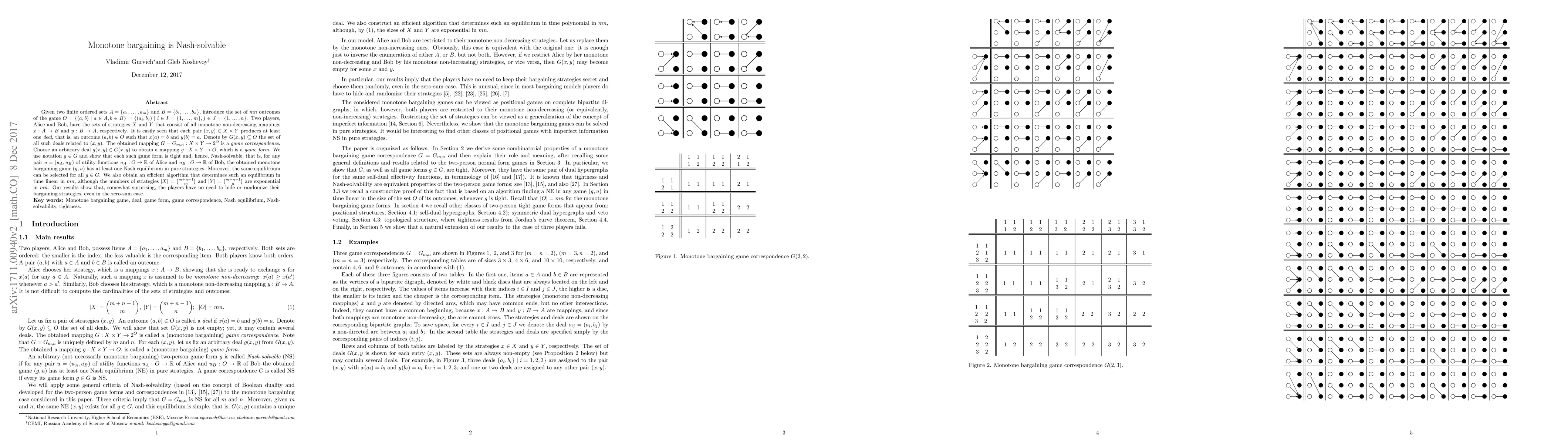 Given two finite ordered sets $A = \{a_1, \ldots, a_m\}$ and $B = \{b_1, \ldots, b_n\}$, introduce the set of $m n$ outcomes of the game $O = \{(a, b) \mid a \in A, b \in B\} = \{(a_i, b_j) \mid i \in I = \{1, \ldots, m\}, j \in J = \{1, \ldots, n\}$. Two players, Alice and Bob, have the sets of strategies $X$ and $Y$ that consist of all monotone non-decreasing mappings $x: A \rightarrow B$ and $y: B \rightarrow A$, respectively. It is easily seen that each pair $(x,y) \in X \times Y$ produces at least one {\em deal}, that is, an outcome $(a,b) \in O$ such that $x(a) = b$ and $y(b) = a$. Denote by $G(x,y) \subseteq O$ the set of all such deals related to $(x,y)$. The obtained mapping $G = G_{m,n}: X \times Y \rightarrow 2^O$ is a game correspondence. Choose an arbitrary deal $g(x,y) \in G(x,y)$ to obtained a mapping $g : X \times Y \rightarrow O$, which is a game form. We will show that each such game form is tight and, hence, Nash-solvable, that is, for any pair $u = (u_A, u_B)$ of utility functions $u_A : O \rightarrow \mathbb R$ of Alice and $u_B: O \rightarrow \mathbb R$ of Bob, the obtained monotone bargaining game $(g, u)$ has at least one Nash equilibrium in pure strategies. Moreover, the same equilibrium can be chosen for all selections $g(x,y) \in G(x,y)$. We also obtain an efficient algorithm that determines such an equilibrium in time linear in $m n$, although the numbers of strategies $|X| = \binom{m+n-1}{m}$ and $|Y| = \binom{m+n-1}{n}$ are exponential in $m n$. Our results show that, somewhat surprising, the players have no need to hide or randomize their bargaining strategies, even in the zero-sum case.
