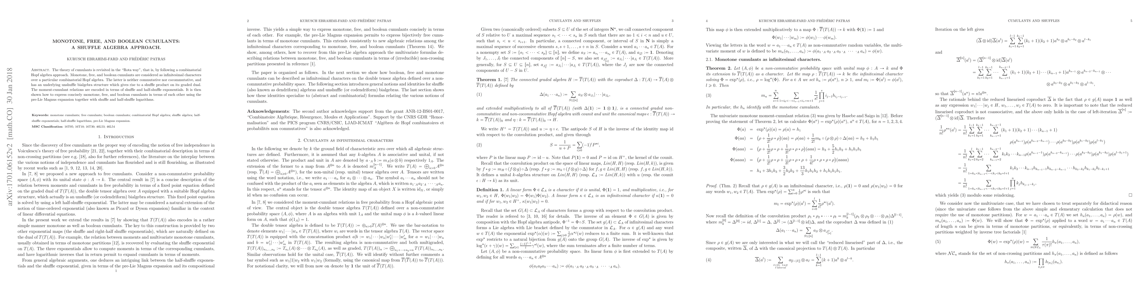 The theory of cumulants is revisited in the "Rota way", that is, by following a combinatorial Hopf algebra approach. Monotone, free, and boolean cumulants are considered as infinitesimal characters over a particular combinatorial Hopf algebra. The latter is neither commutative nor cocommutative, and has an underlying unshuffle bialgebra structure which gives rise to a shuffle product on its graded dual. The moment-cumulant relations are encoded in terms of shuffle and half-shuffle exponentials. It is then shown how to express concisely monotone, free, and boolean cumulants in terms of each other using the pre-Lie Magnus expansion together with shuffle and half-shuffle logarithms.