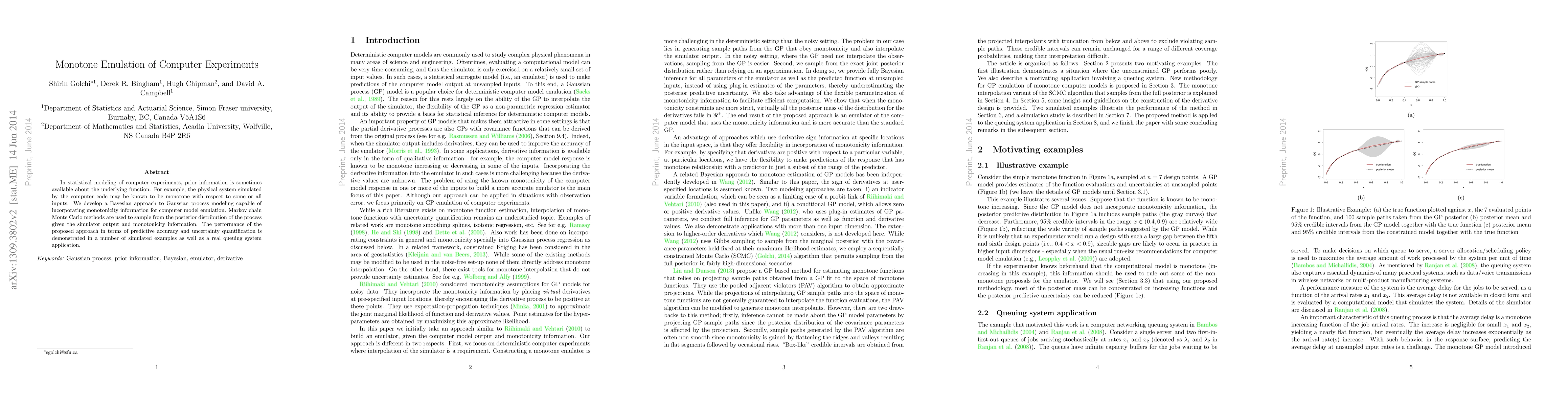 This paper proposes a Bayesian Gaussian process model that incorporates monotonicity information for computer experiment emulation, utilizing Markov chain Monte Carlo methods for posterior sampling. The approach is demonstrated to improve predictive accuracy and uncertainty quantification in both simulated and real-world applications.