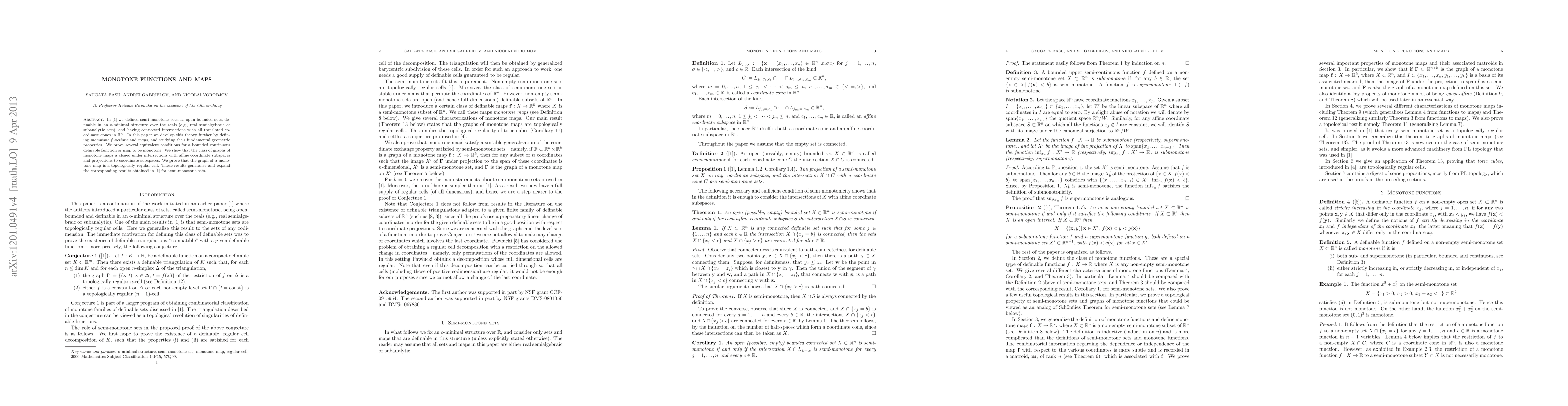 This paper extends the theory of semi-monotone sets by defining and studying monotone functions and maps within an o-minimal structure. It proves several conditions for bounded continuous definable functions or maps to be monotone and shows that the graphs of such maps are topologically regular cells.